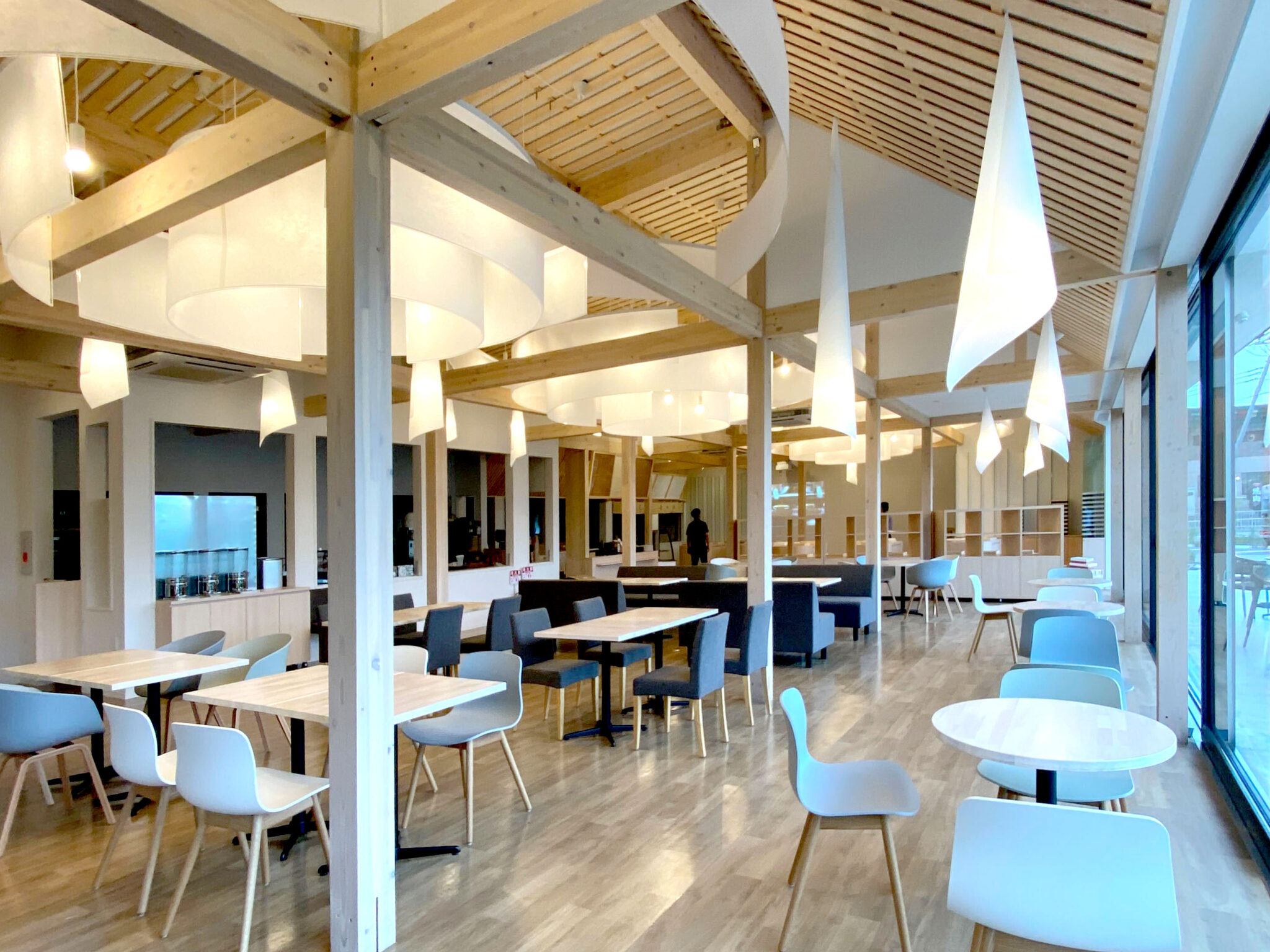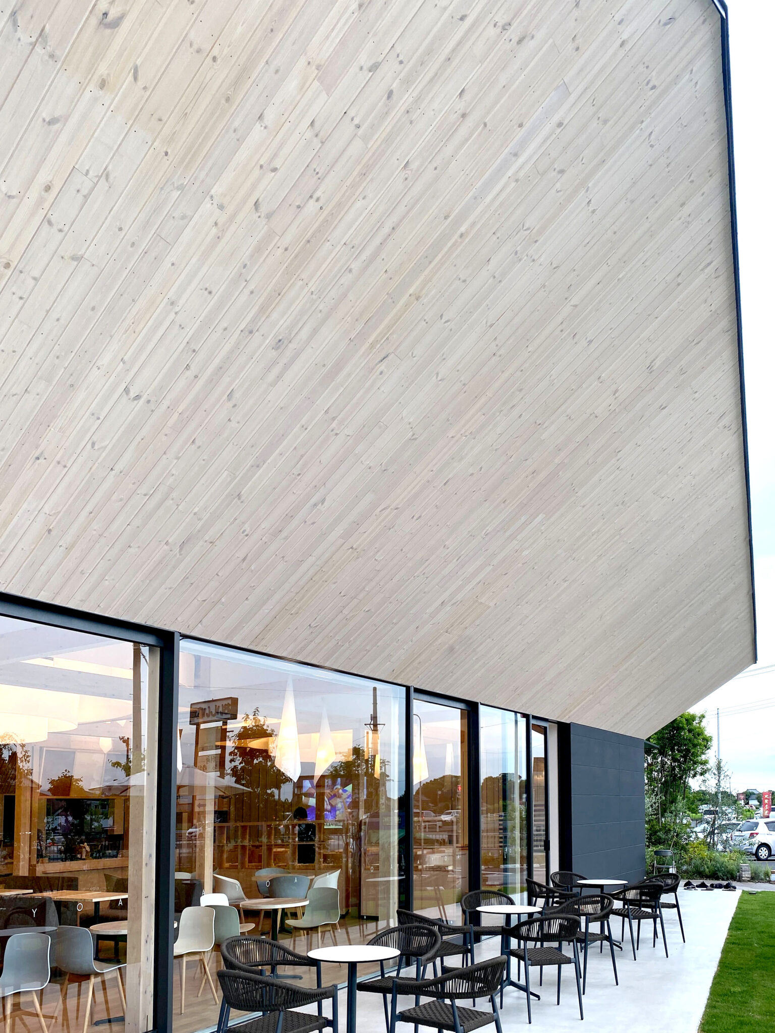 To give the wooden building with a pitched roof a light and bright impression, the roof is peeled up, and beneath it a fully glazed, large-scale opening is introduced. The design aspires to create a giant food stall that seamlessly integrates with the street.
