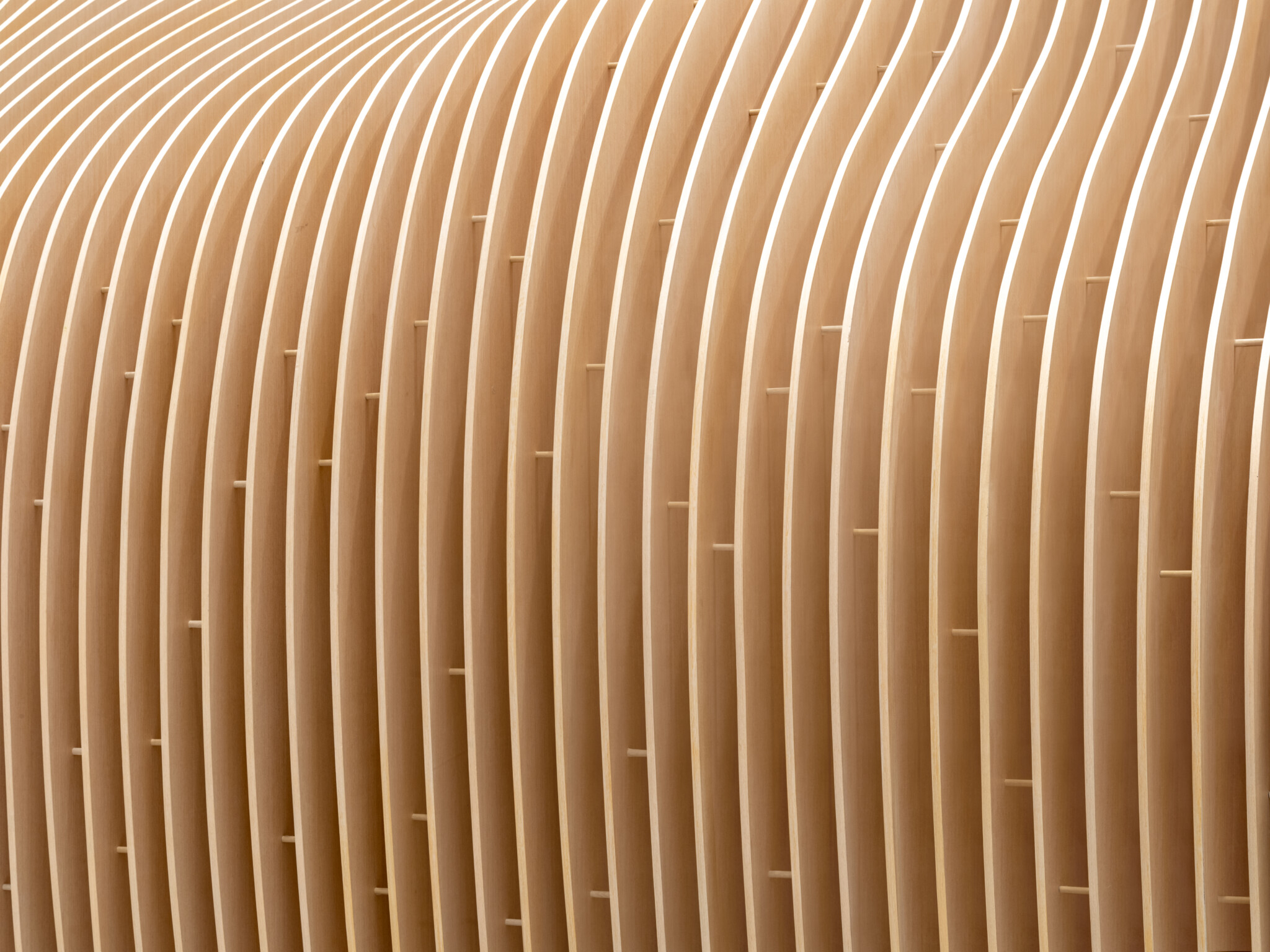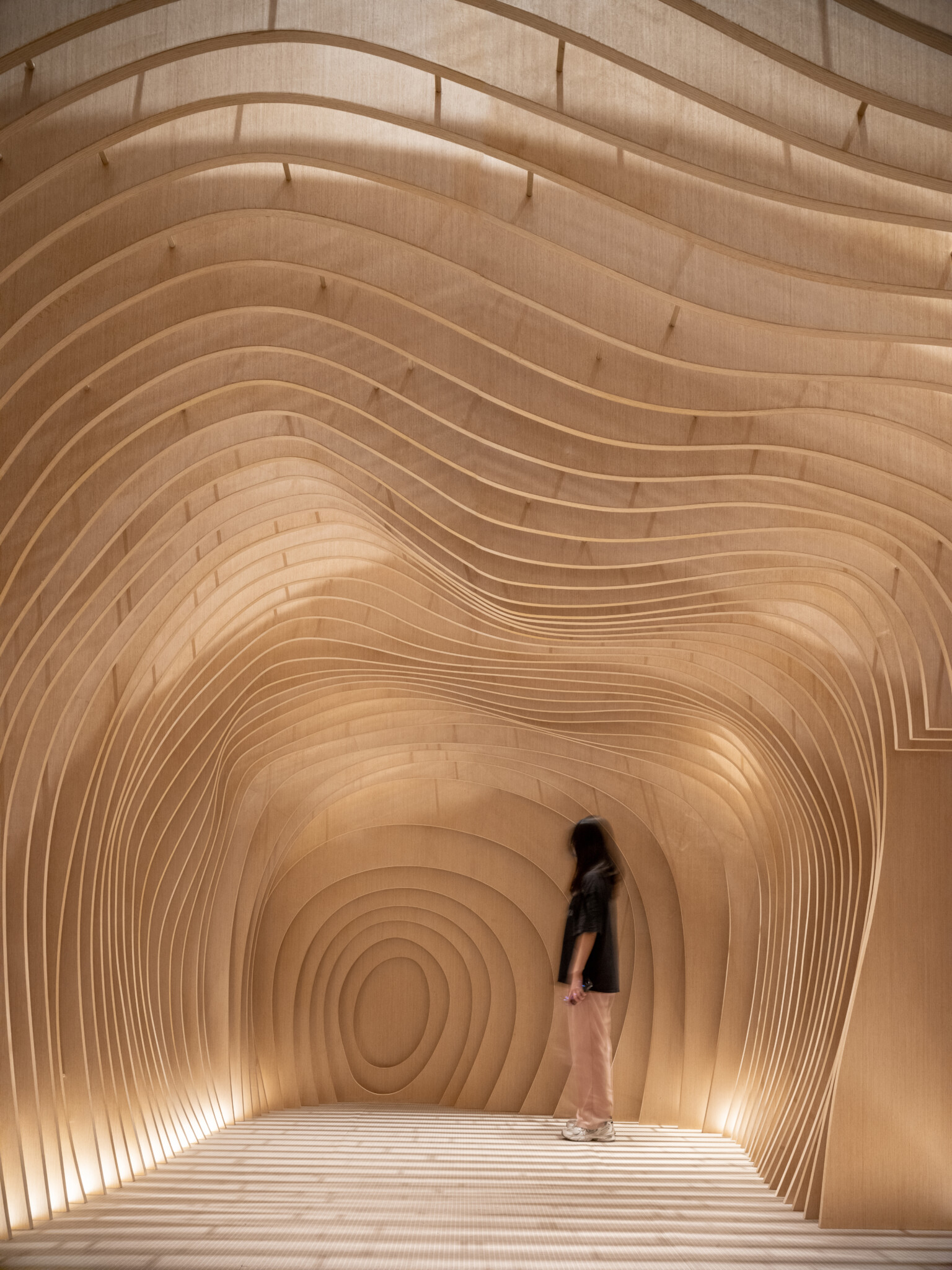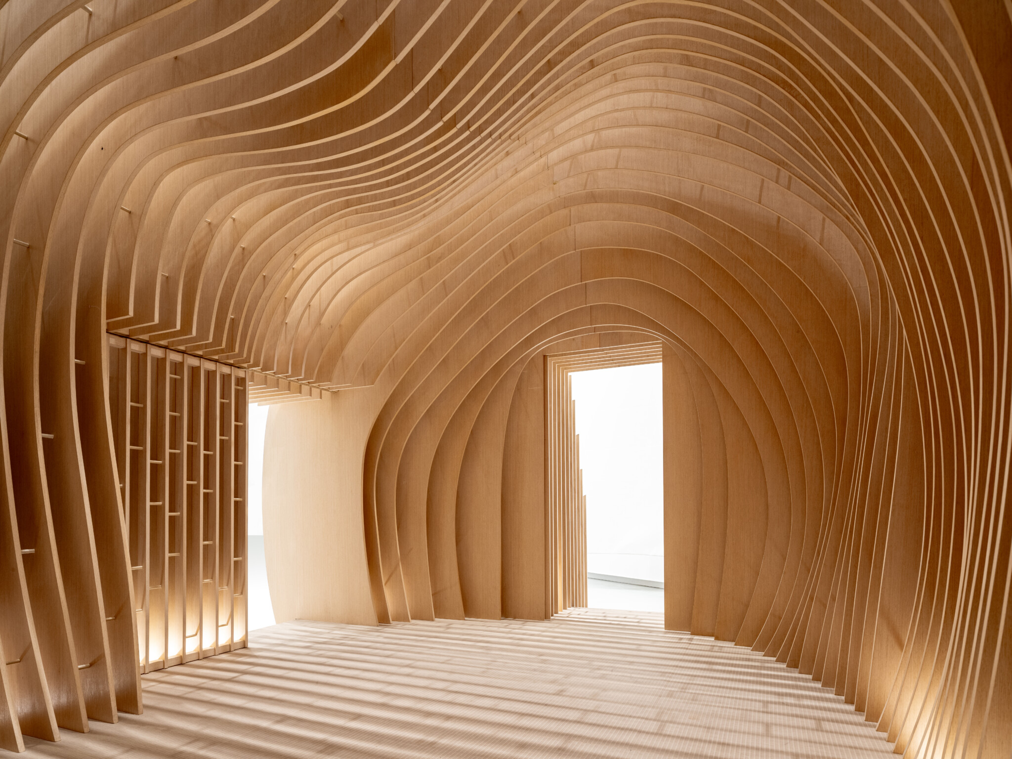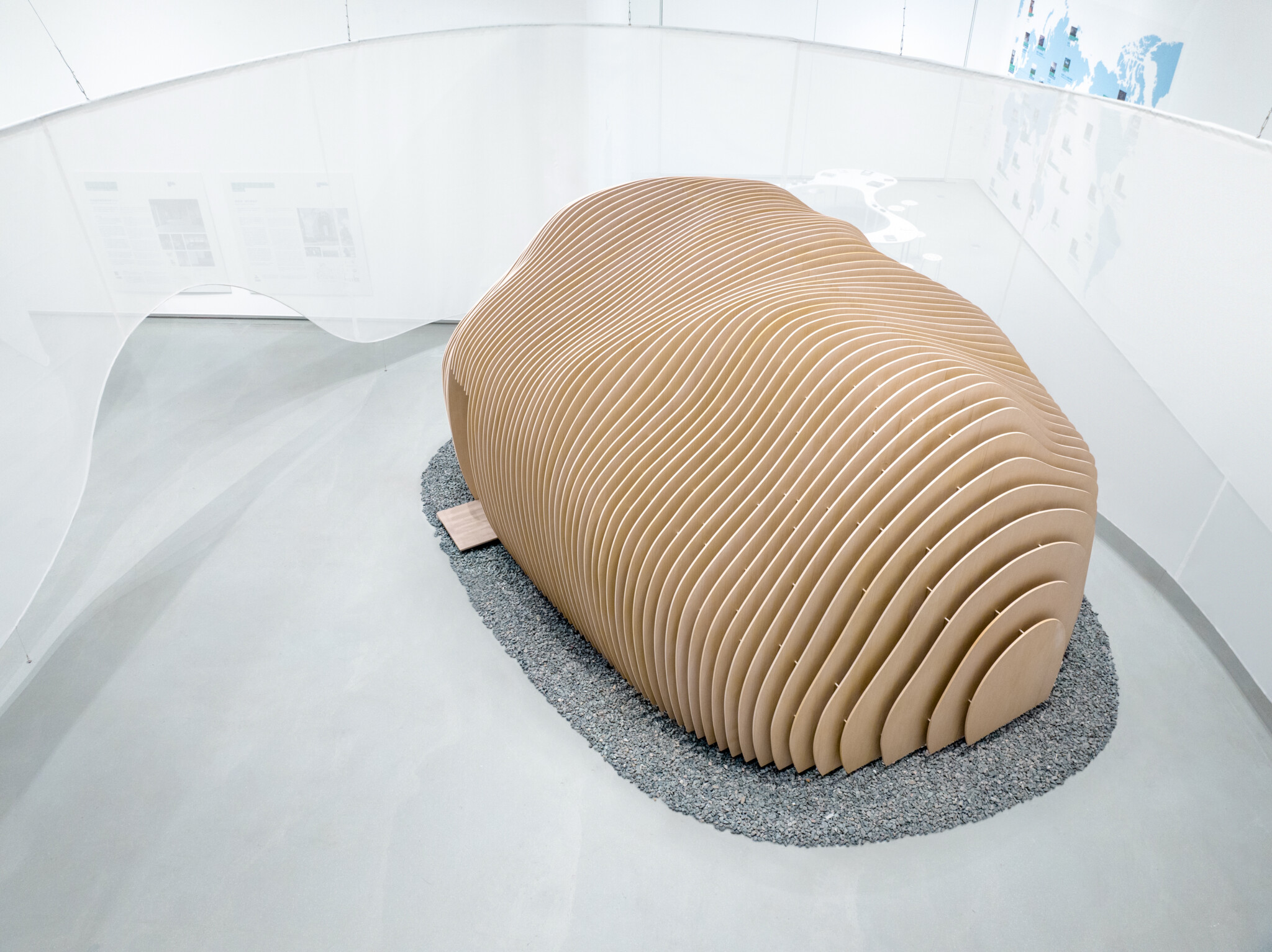One of exhibited work COCOON was inspired by the distorted tea bowls favored by tea masters in ancient times, we designed a wooden tea house with a deformed shape.