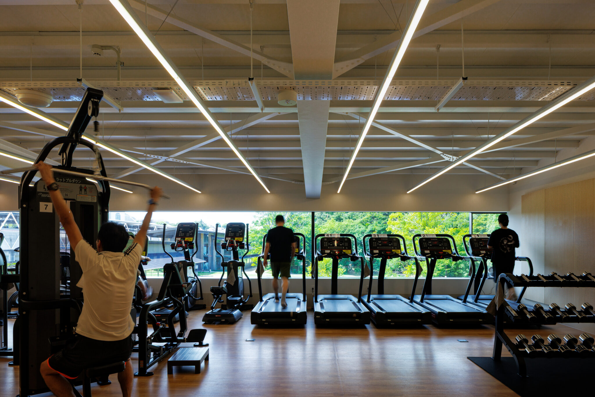 The columns at the front of the building, supporting the roof, were minimized to 75 mm square sections on the first floor and 65 mm squares on the second floor by transferring horizontal loads to the reinforced concrete volume behind. This allowed the slender columns to almost disappear into the shadows, reducing their visual presence. The result is a space where citizens can enjoy sports and cultural activities in an environment seamlessly connected to the park.