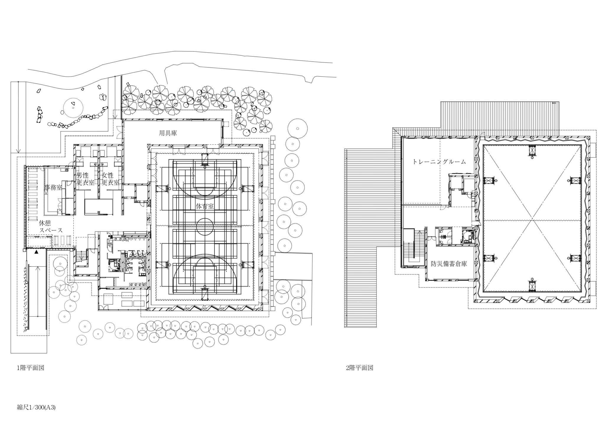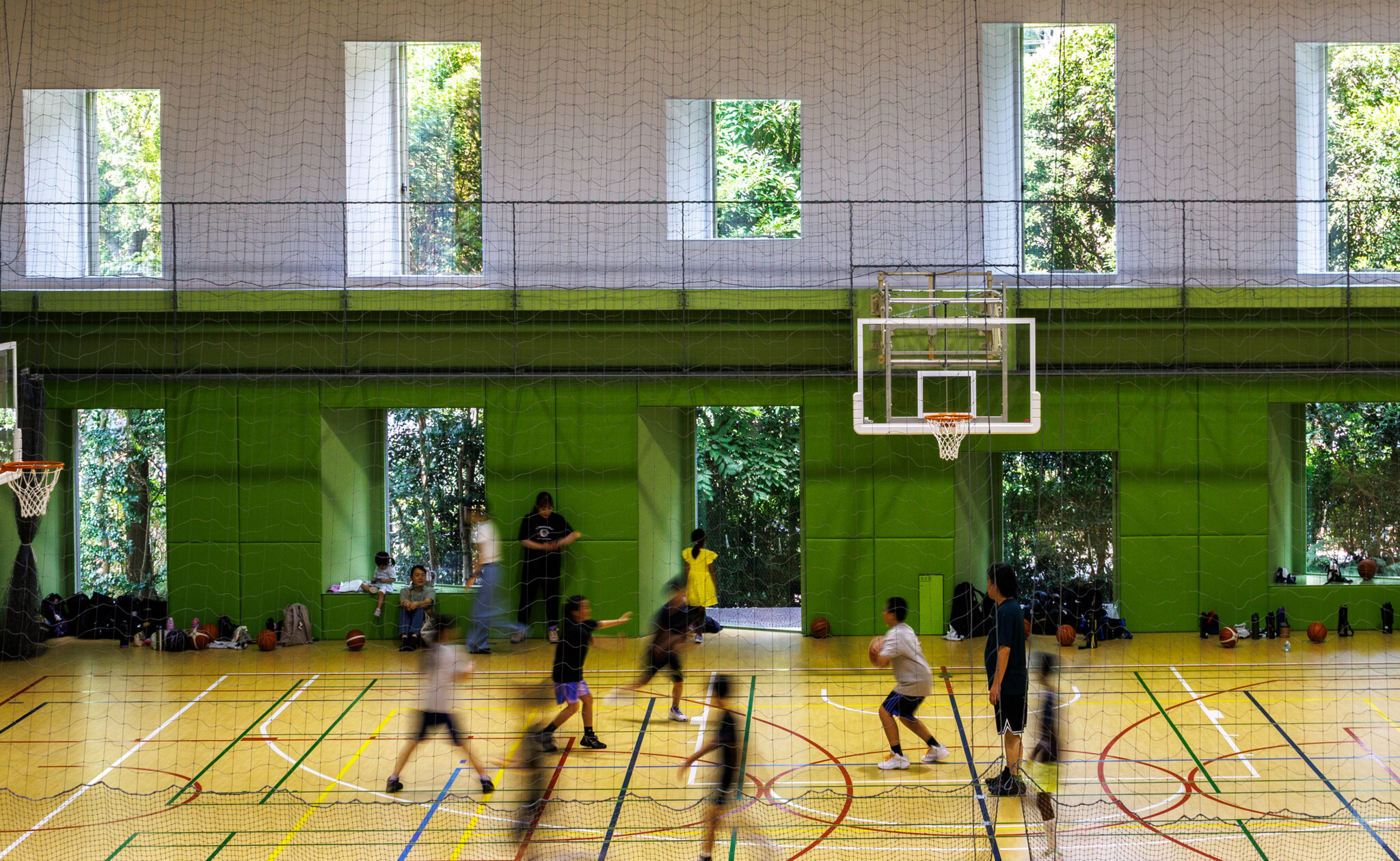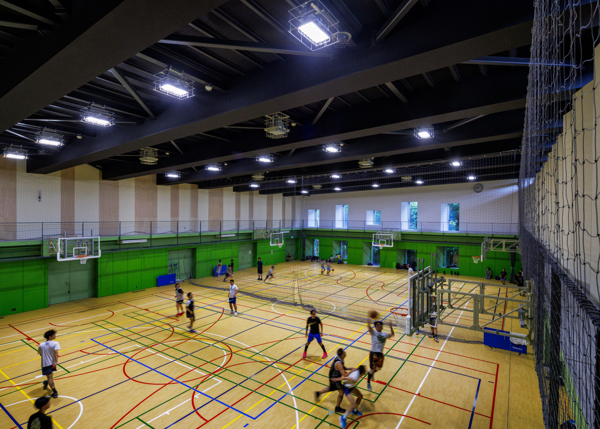To integrate the sports facility, which requires a high ceiling, we introduced a transitional space called a “geya,” extending into the park; a lower-roofed area at the front housing various functions. In addition, by adopting a staggered plan, the gymnasium blends seamlessly with the surrounding park.