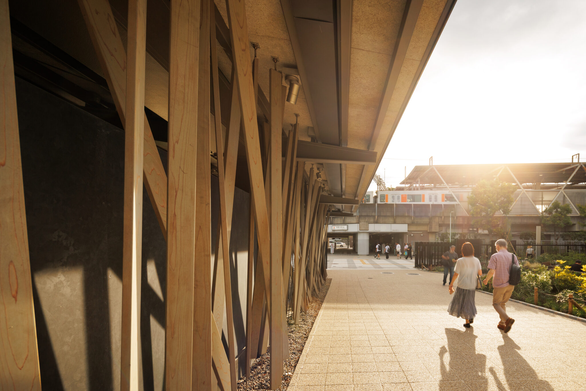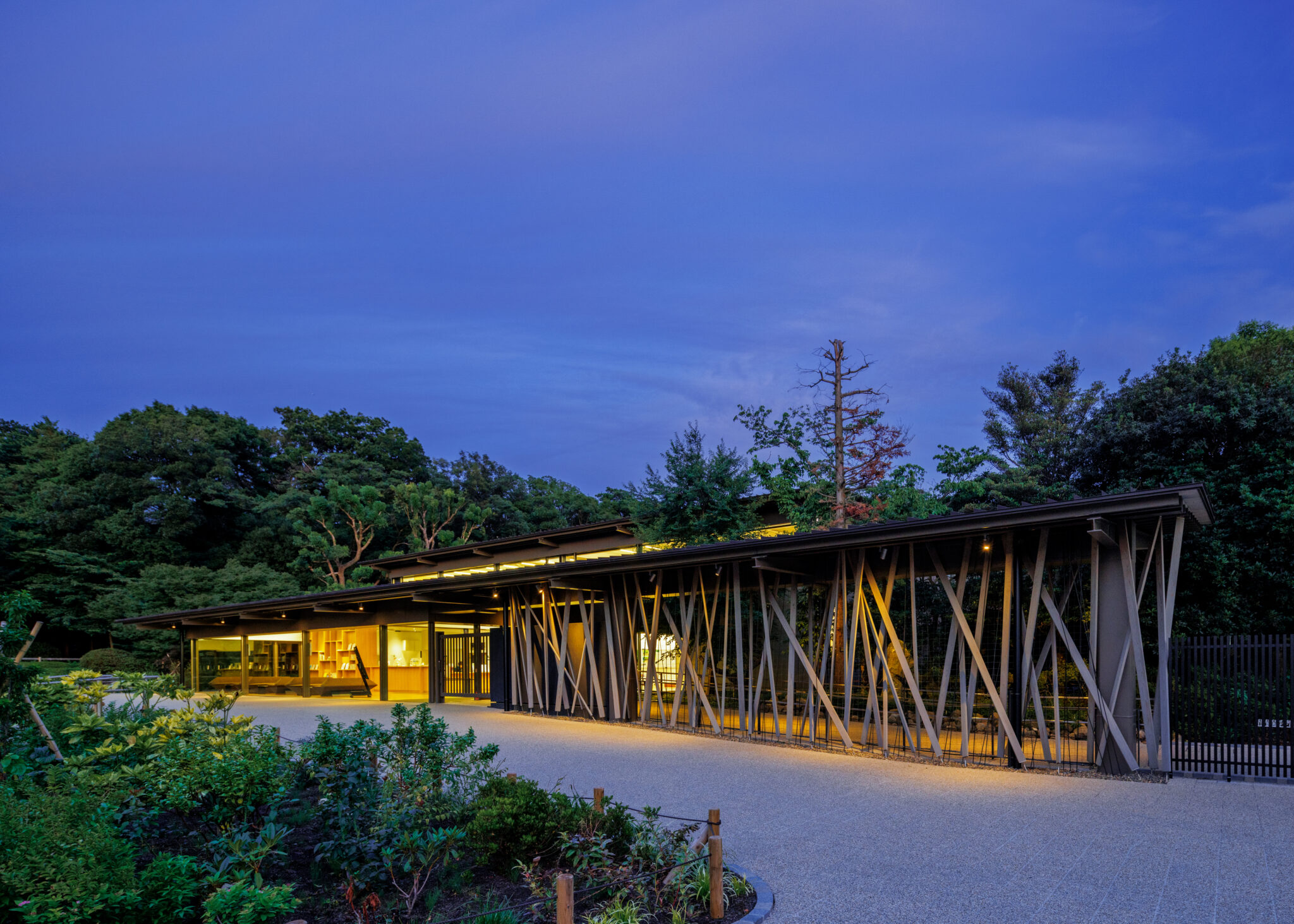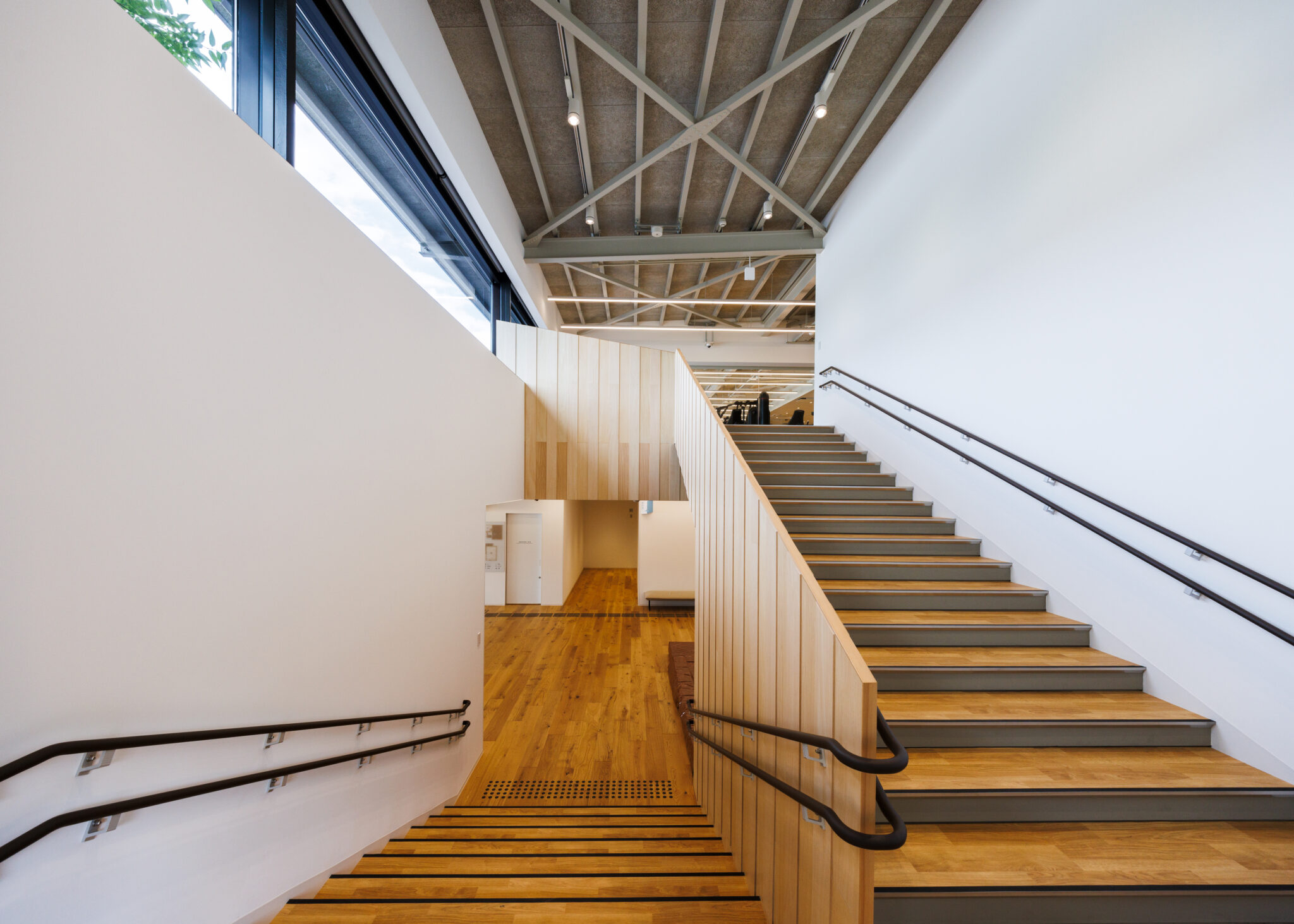 To integrate the sports facility, which requires a high ceiling, we introduced a transitional space called a “geya,” extending into the park; a lower-roofed area at the front housing various functions. In addition, by adopting a staggered plan, the gymnasium blends seamlessly with the surrounding park.