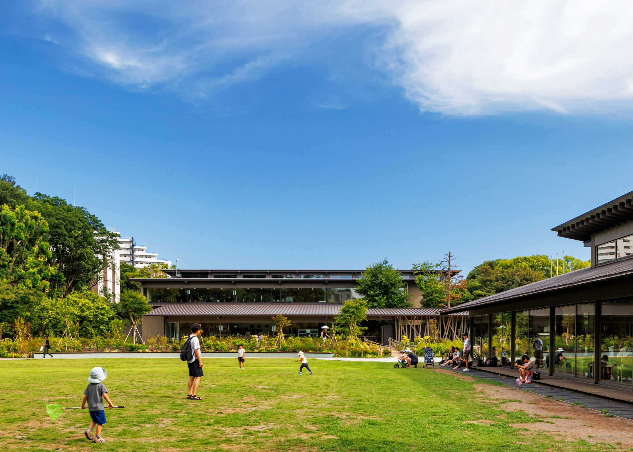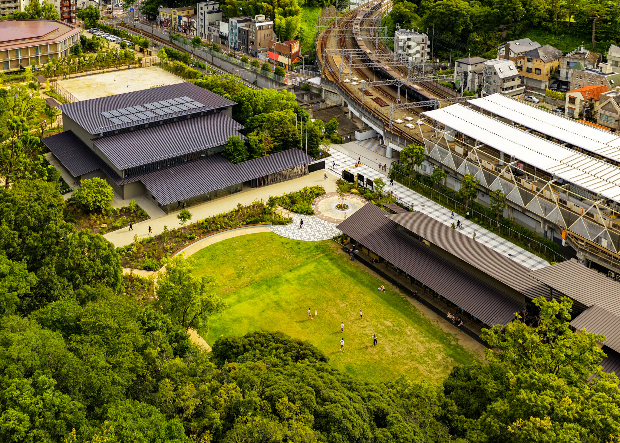 We designed a sports facility adjacent to the cultural complex “Seseragi Hall”(2020) in Denenchofu Seseragi Park, located on the unique topography of the Kokubunji cliff line —a river terrace formed by the Tamagawa River.