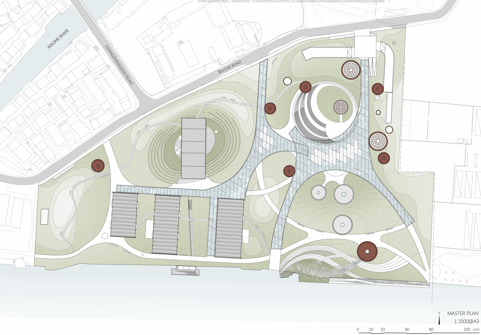 Located on the riverbank of world heritage the Grand Canal, Xiaohe Park took over the abandoned industrial site of an oil factory and transformed into a multi-use open park for the public.