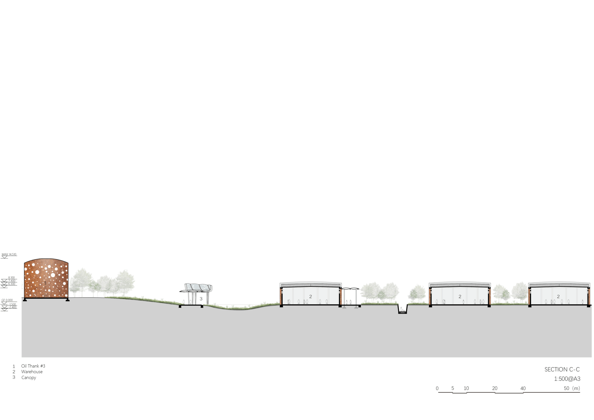 We have preserved 4 historical warehouses and 7 oil tanks, renovated them into a theater, event space, shops, and vertical connections. In preserving the warehouse building we will use Corten steel to match exposed concrete and red bricks, thus preserving the unique industrial identity of the site. A large circular sunken garden brings sunlight and greenery to the newly built retail area underneath the park.