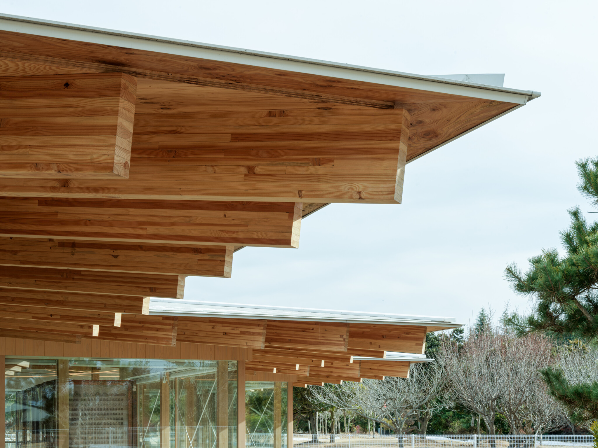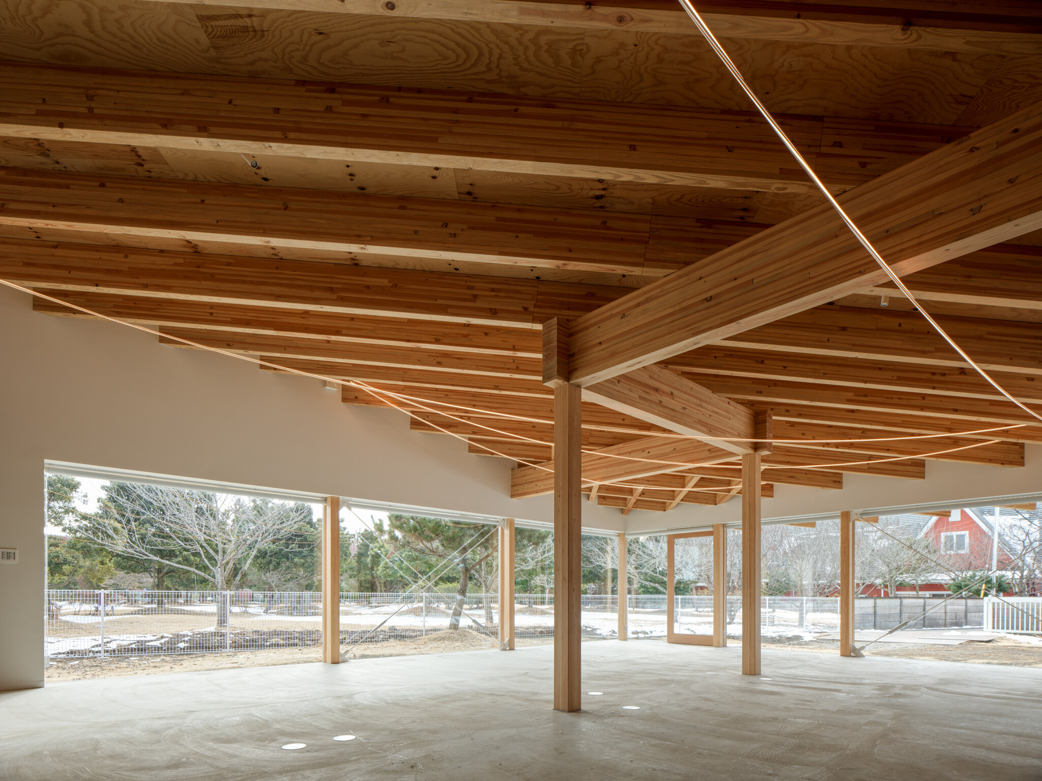 By arranging the wooden joists in resistance to the planar XY-axe that govern spatial order, the roof is released from the constraints of the space below, giving rise to a light, liberated wooden architecture.