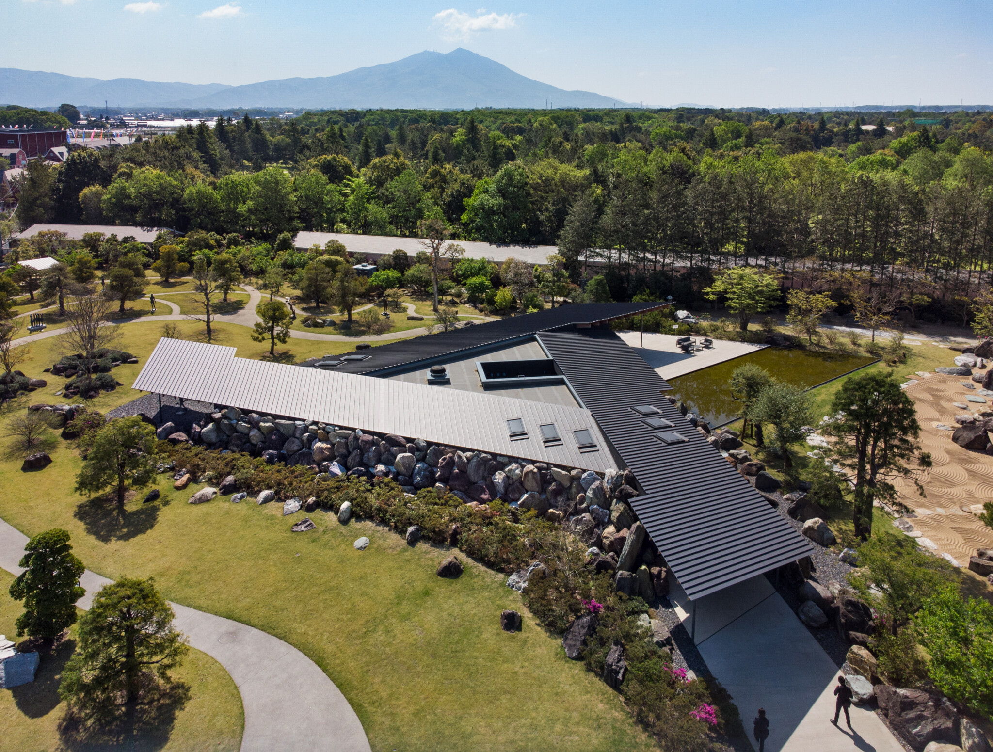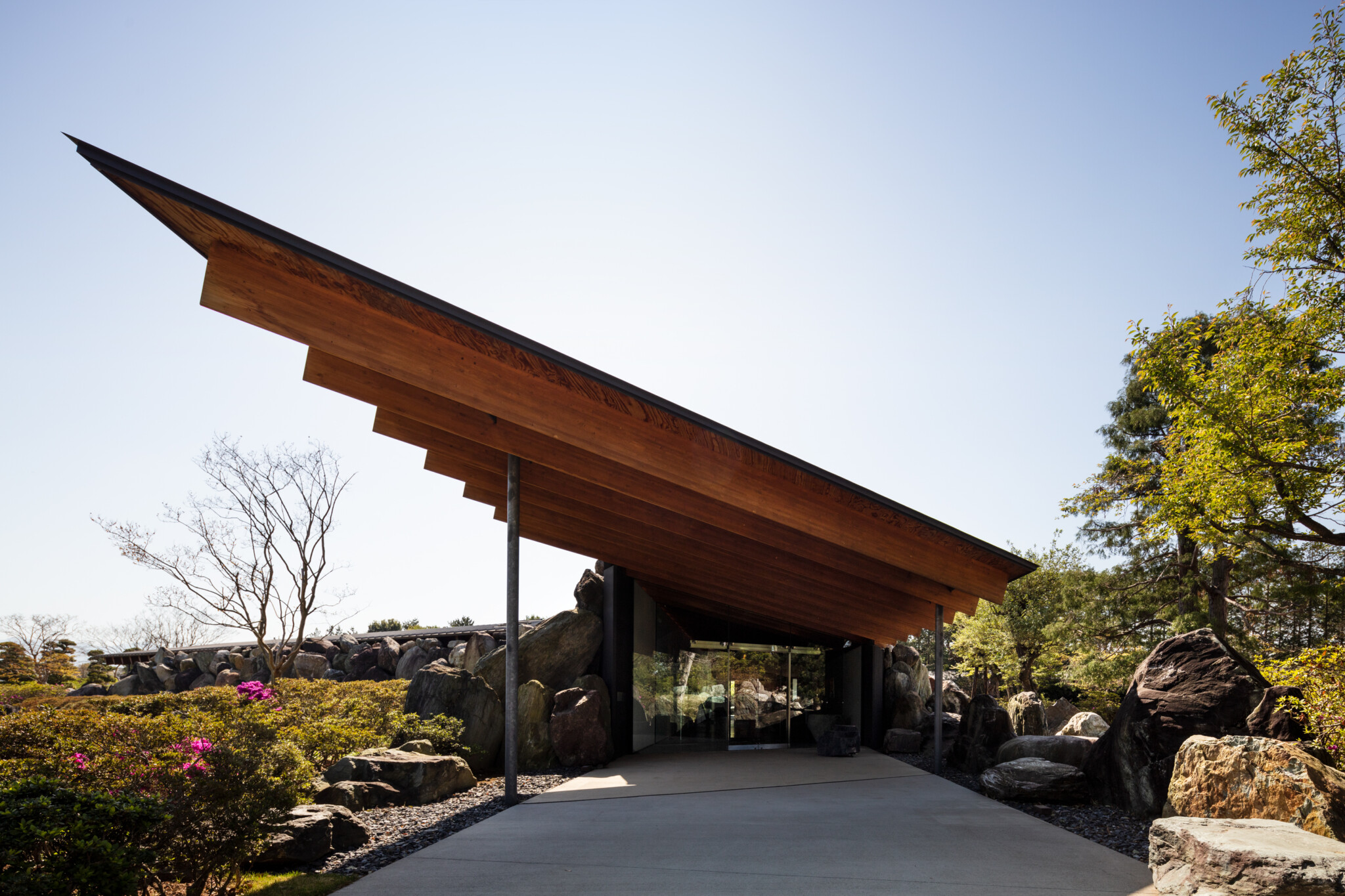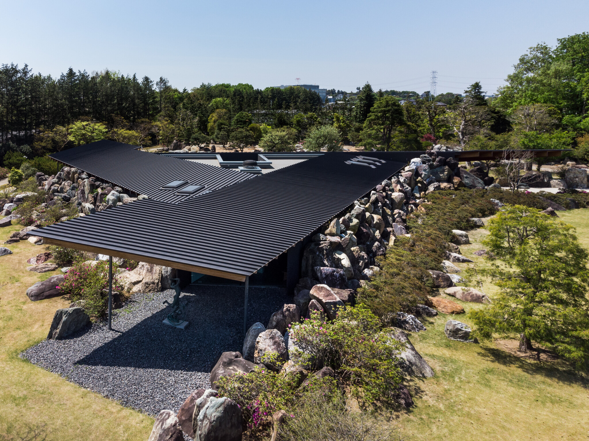 Nestled in the greenery of Chikusei City, Ibaraki Prefecture, a museum was designed to house the collection of Kiyoshi Hirosawa, an art collector. The building and landscape are enveloped by the vast number of megaliths Hirosawa accumulated over many years, allowing the architecture and garden to merge seamlessly, effectively “erasing” the building within the landscape.