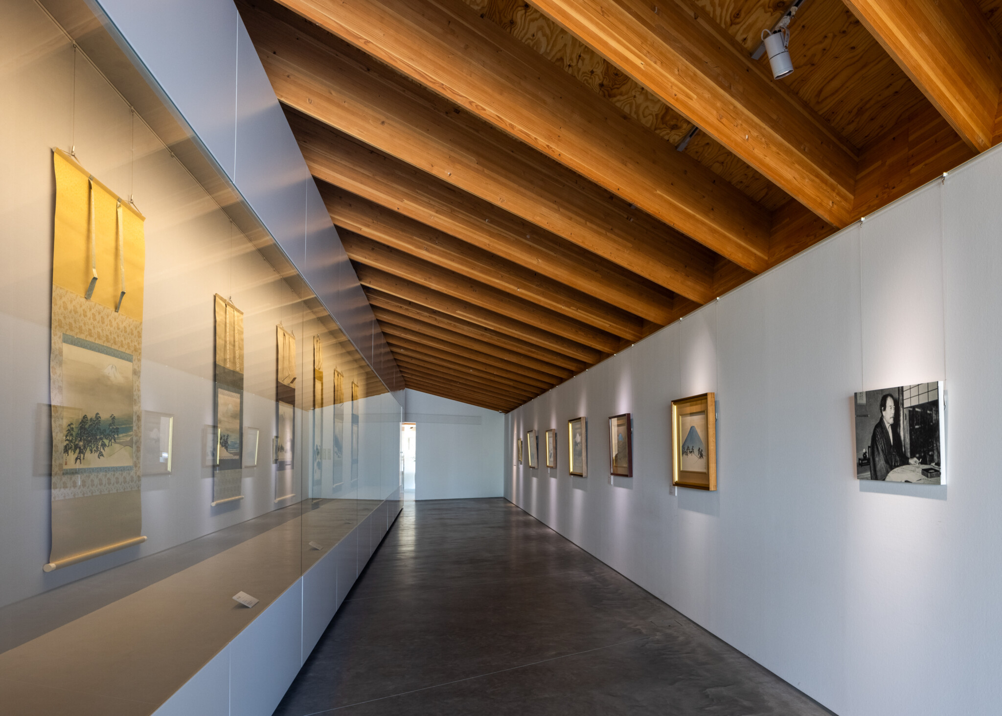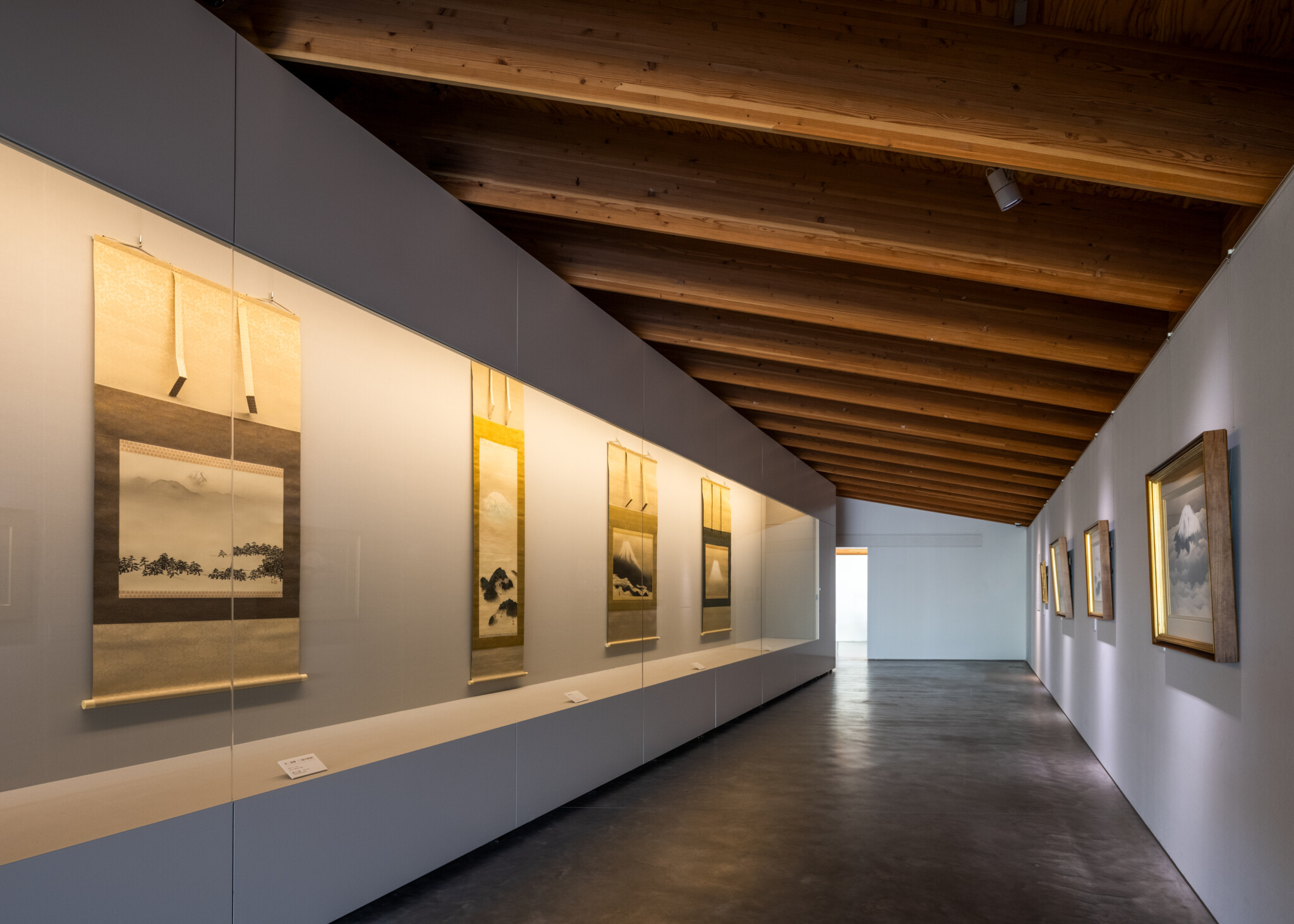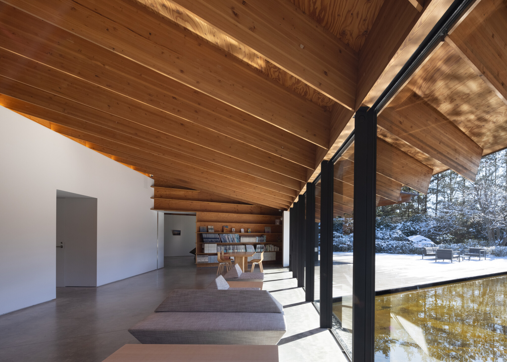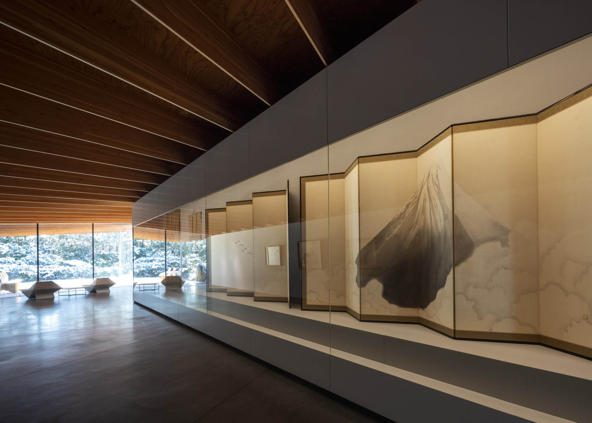 The roof, resting atop the megaliths, is supported by lightweight wooden joinery, with joists exposed inside. In contrast to the weight of the stones, the exhibition spaces feel warm and light.