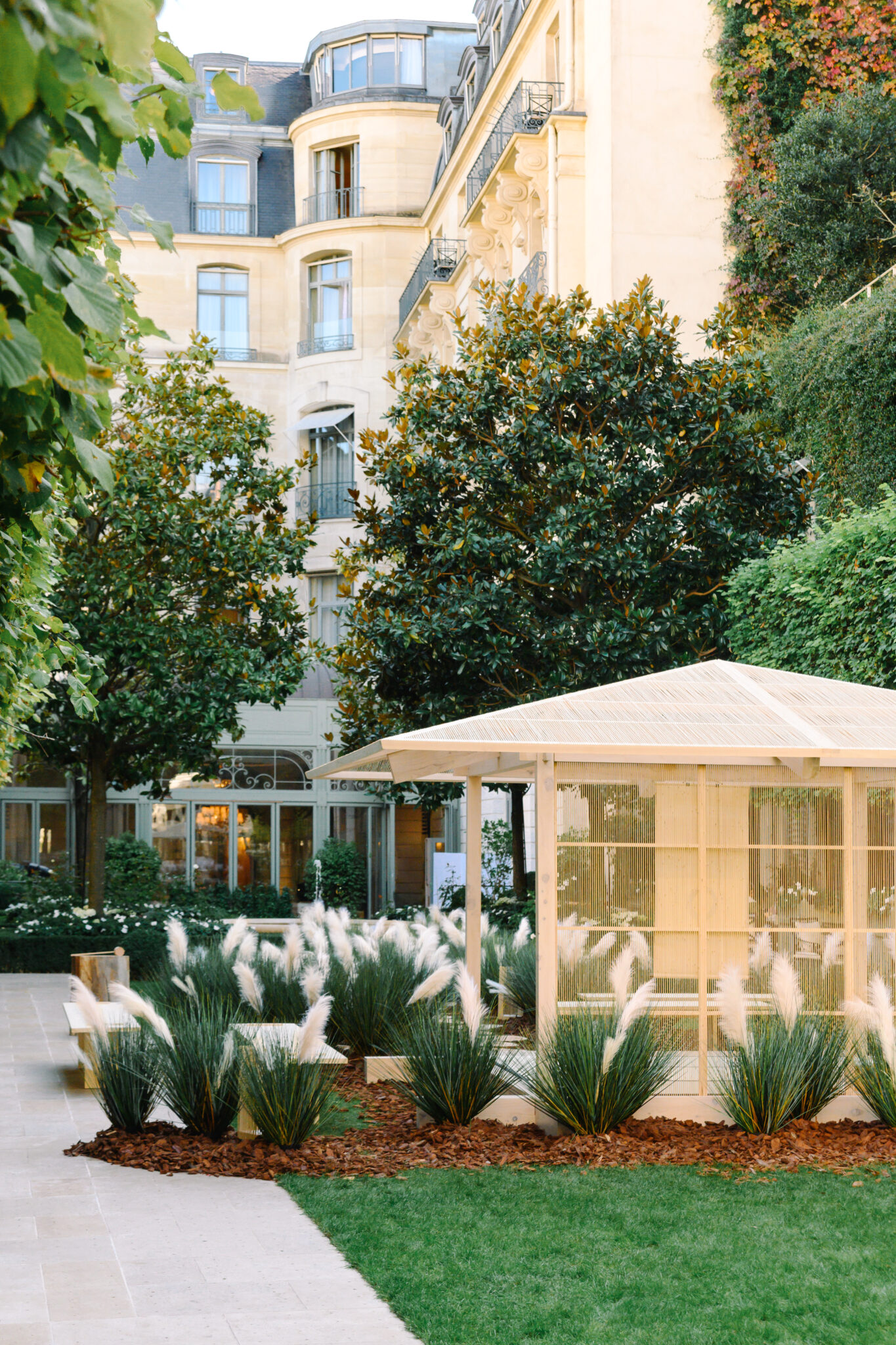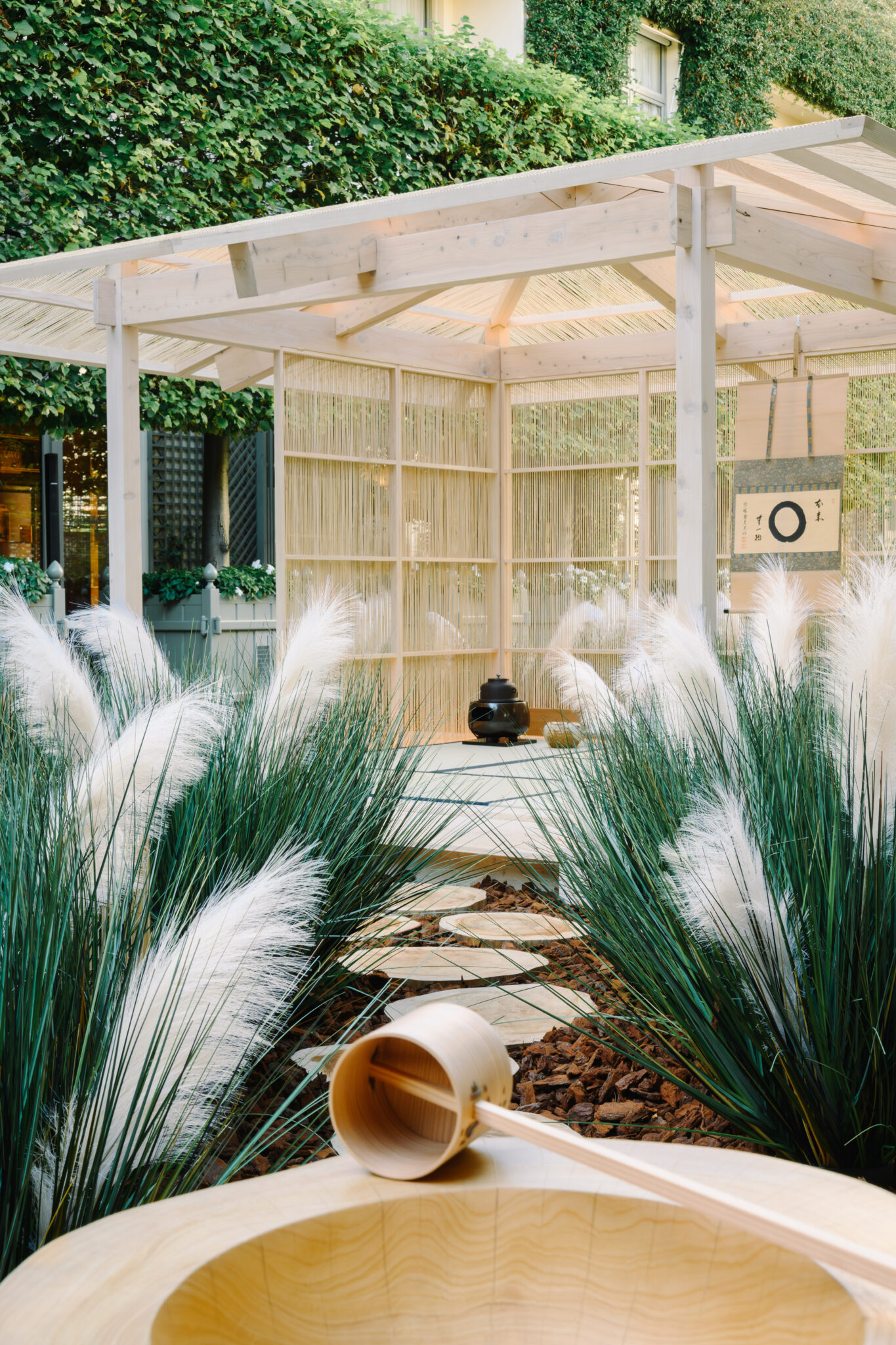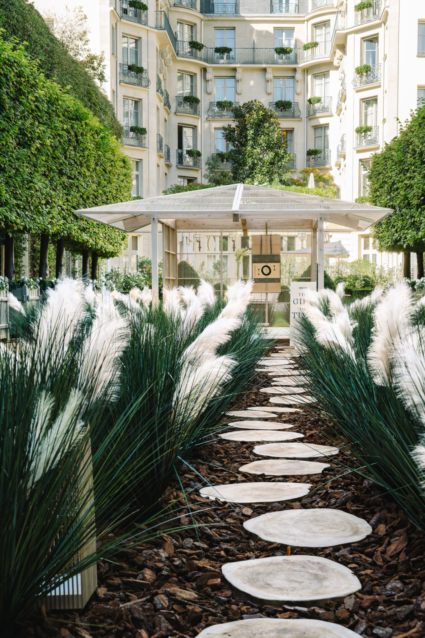 A temporary four-and-a-half-mat tearoom was designed for one night only in the Grand Jardin, the courtyard of the Ritz Hotel facing Place Vendôme in Paris.