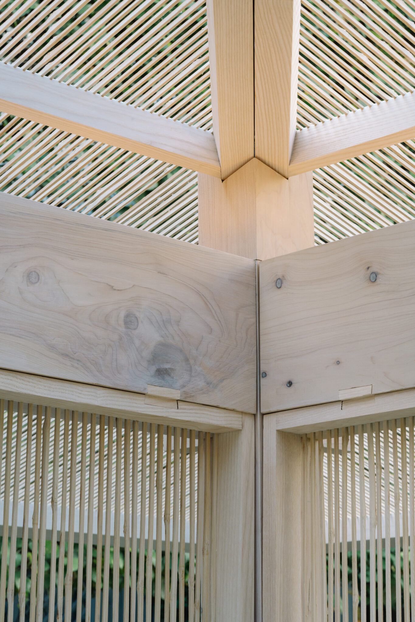 No nails, bolts, or other metal fasteners were used; instead, all the components were joined using the traditional Japanese Kango (interlocking) technique, in which notched members are fitted together. This method not only shortens assembly and disassembly time but also allows the structure to be easily taken apart and relocated — a “traveling tearoom” that can journey to various places.