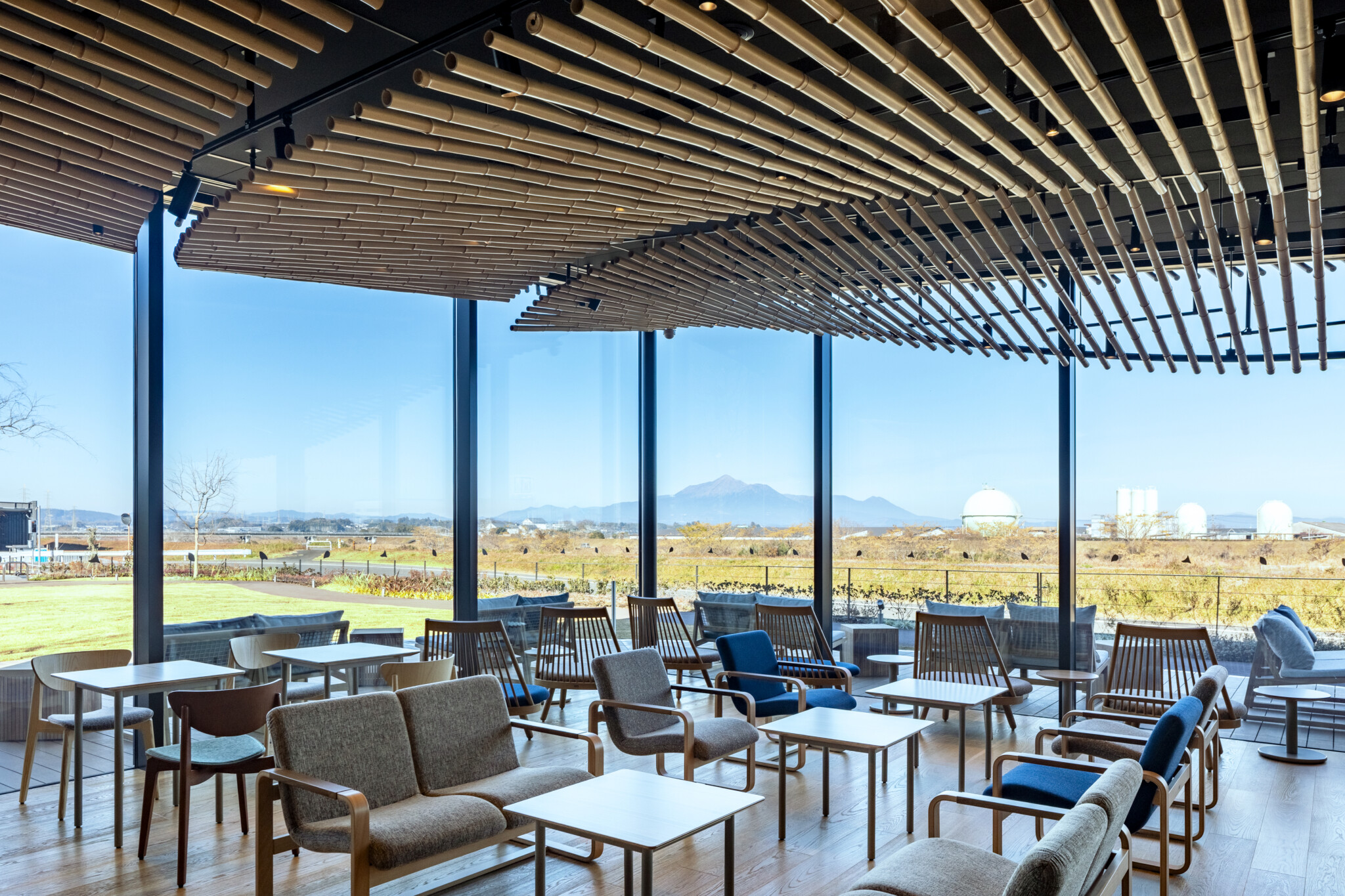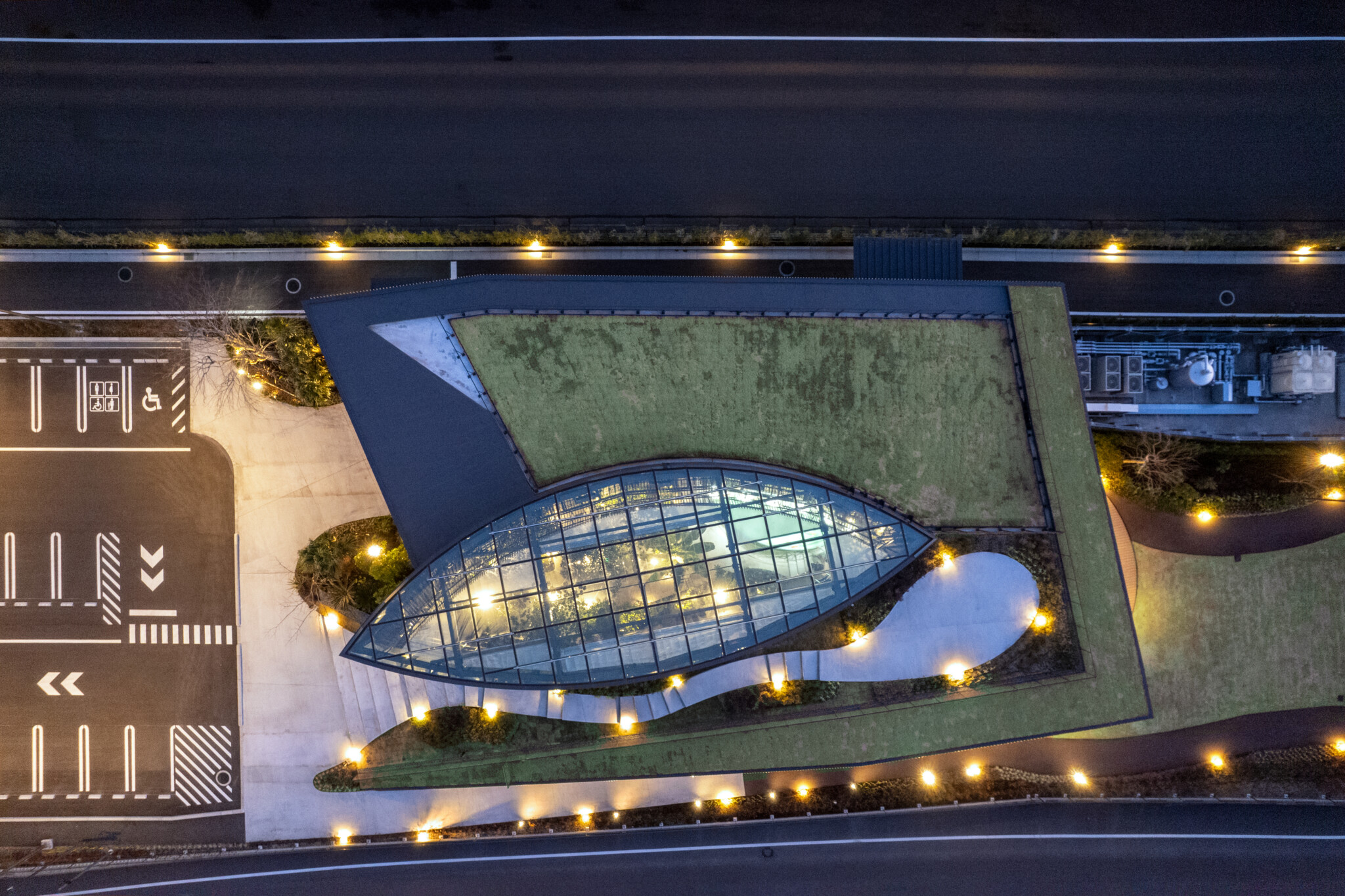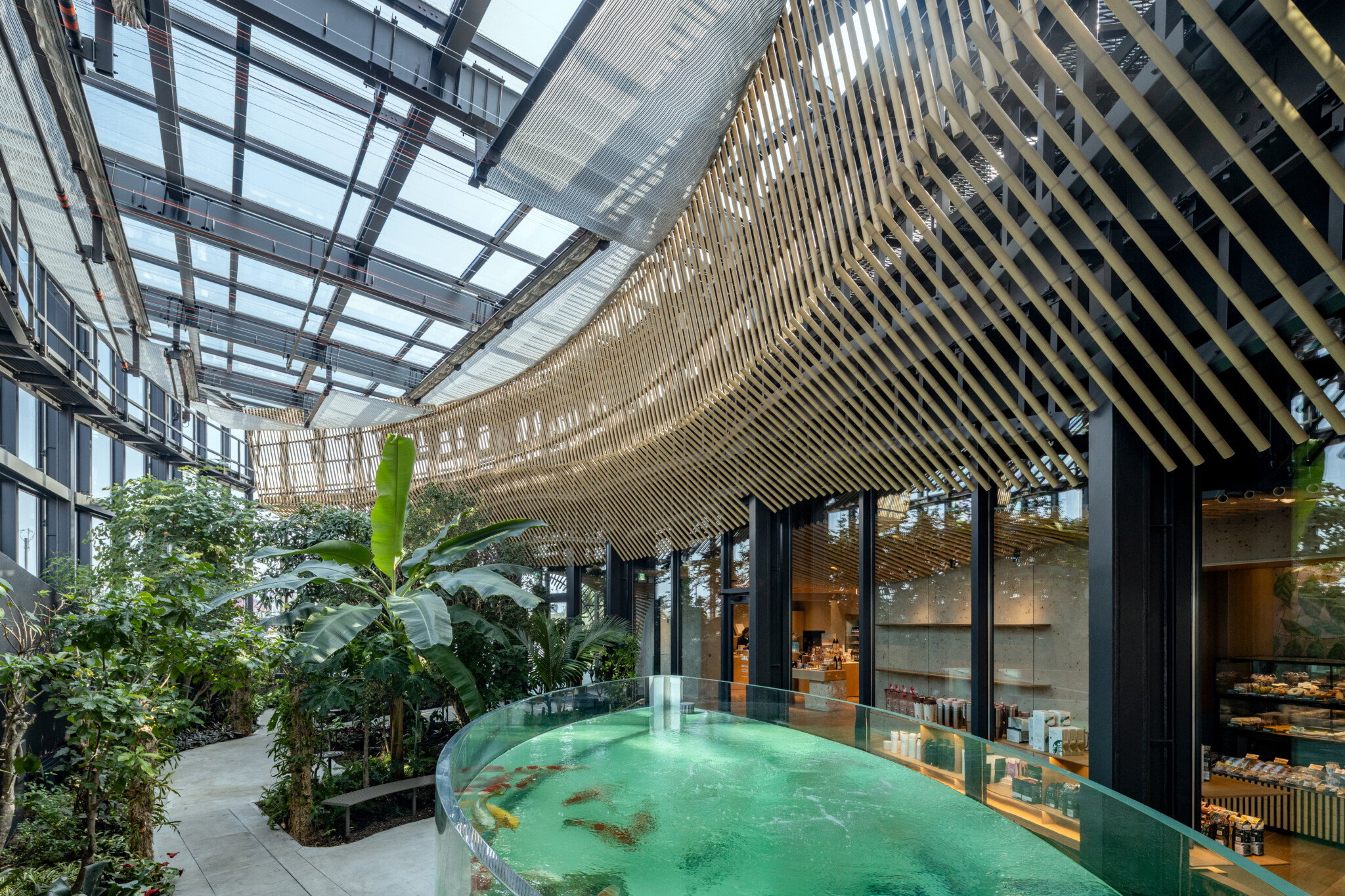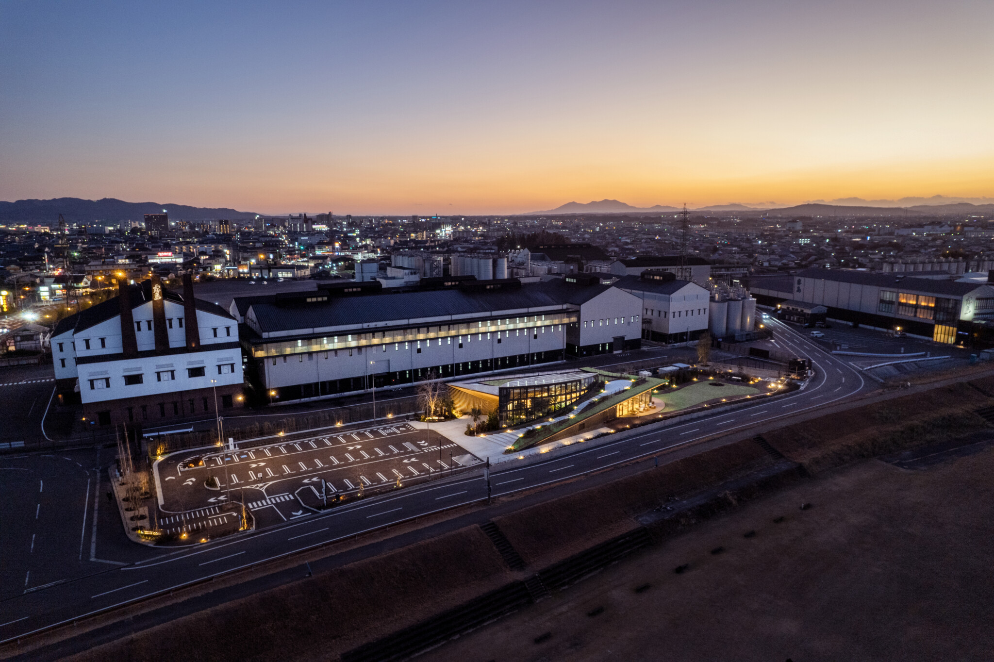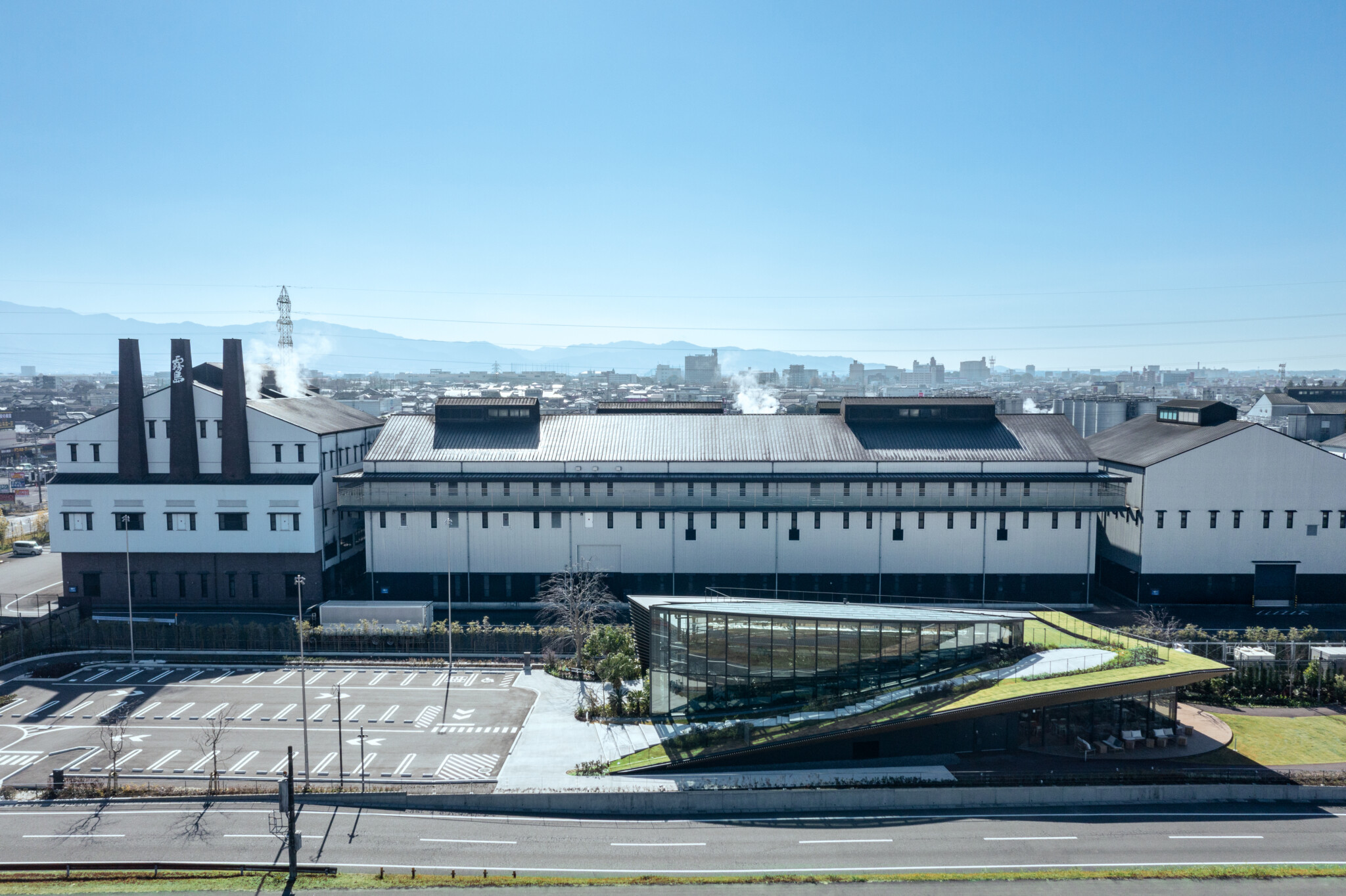 The botanical garden is positioned as an independent glass volume, serving as the symbolic core of the project. It is enveloped by a green hill that rises as if the riverside terrain itself had swelled upward, giving form to an architecture that stands in contrast to the surrounding shochu factory complex as a landscape in its own right.