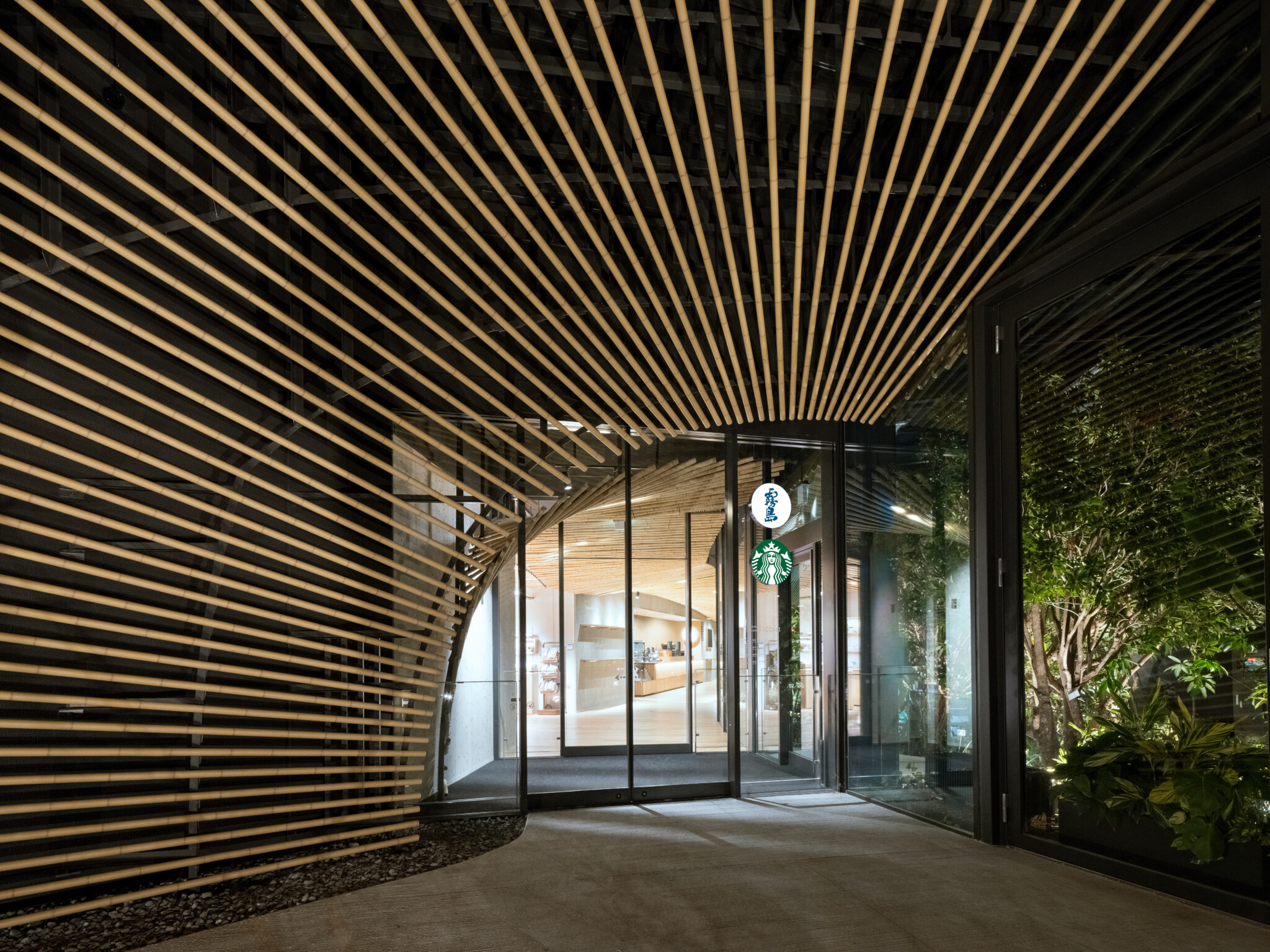 A new material was developed by combining Shirasu—a unique soil found in southern Kyushu that also functions as a natural filtration system producing Kirishima-Rekkasui*, the base water used in Kirishima shochu—with used coffee grounds from Starbucks. This initiative seeks to extend the cross-industry collaboration beyond operations, reflecting it in the building’s materiality and environmental performance.