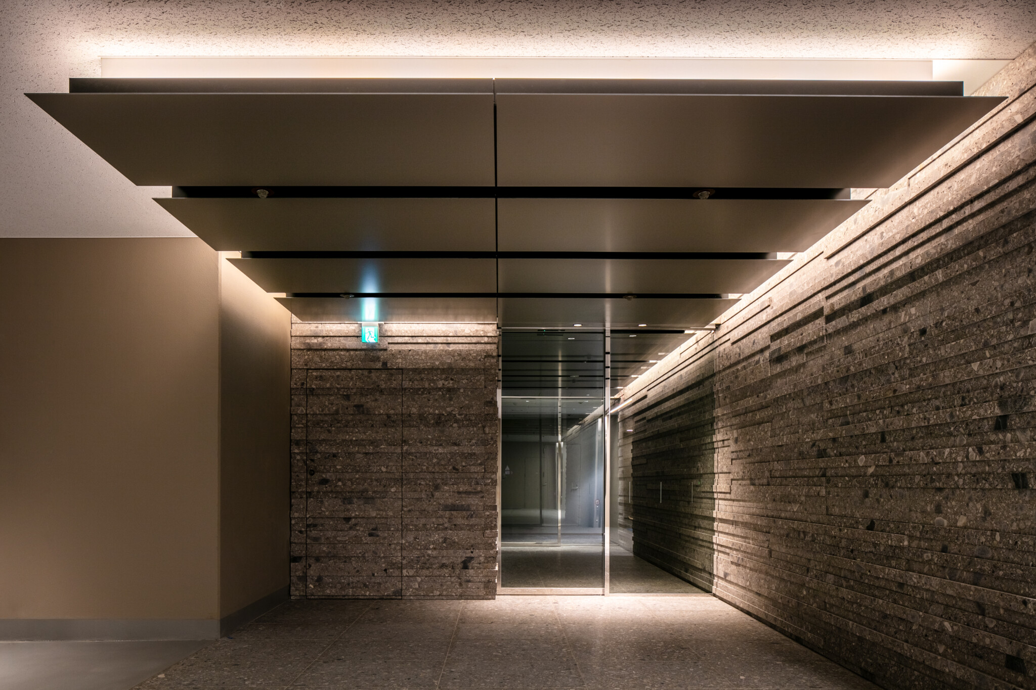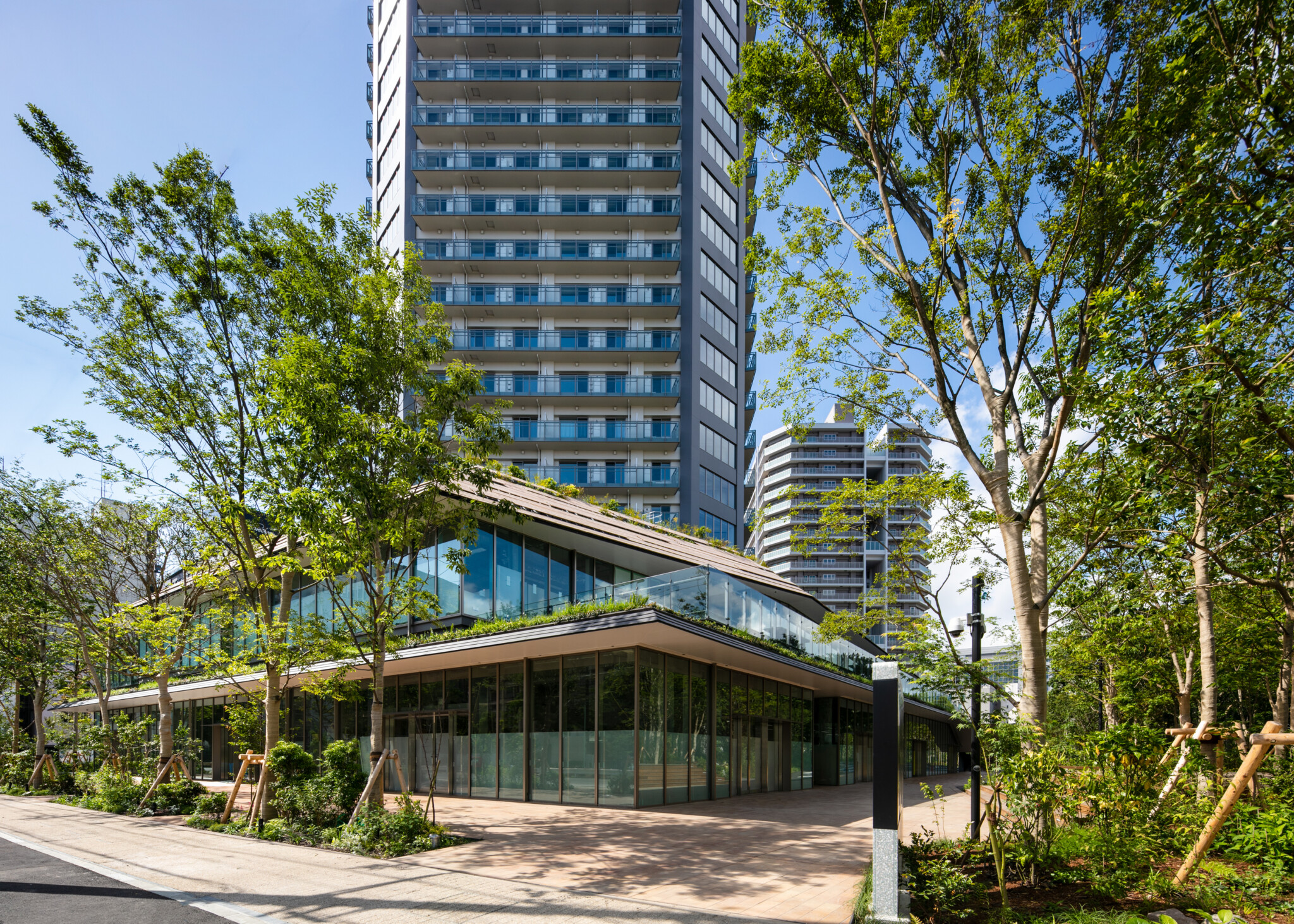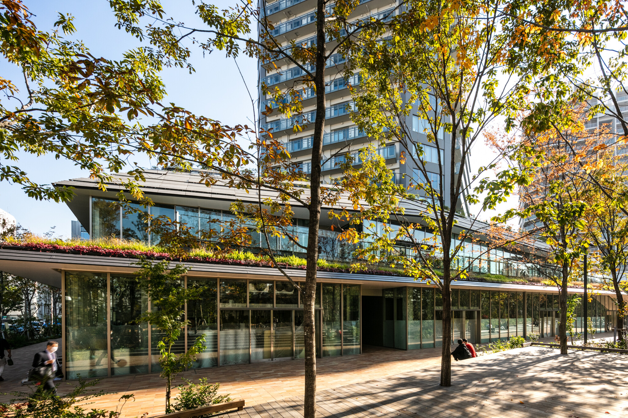 The lower podium is capped with louvers made of small-diameter cedar, creating a roof that imparts a sense of everyday life and a human scale that harmonizes with the ground—qualities typically absent from conventional tower podiums.