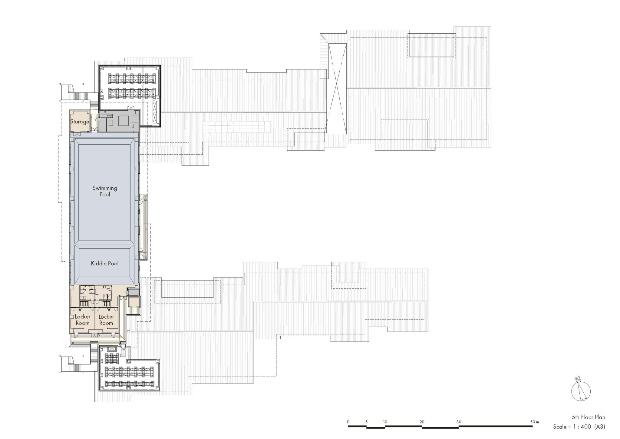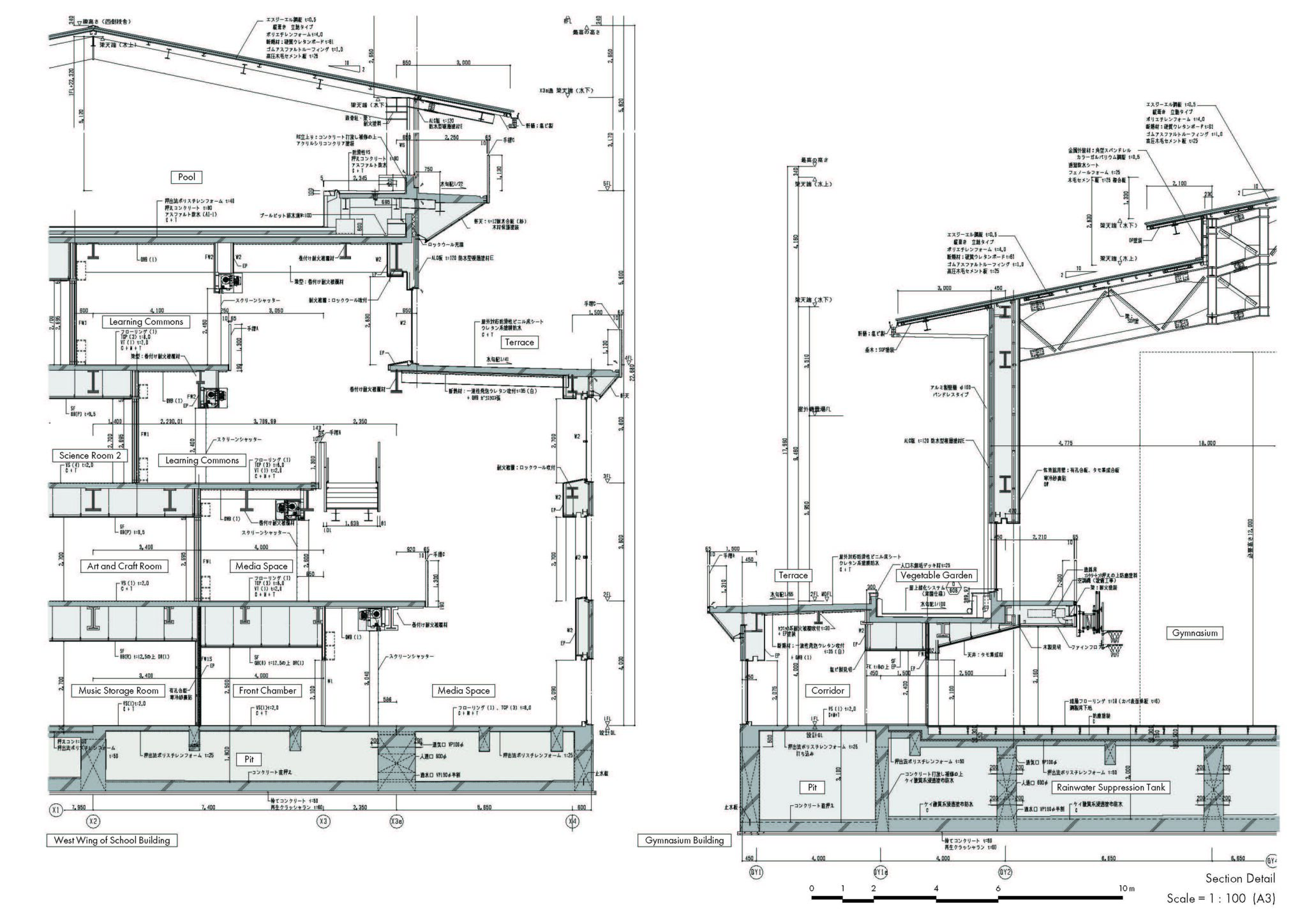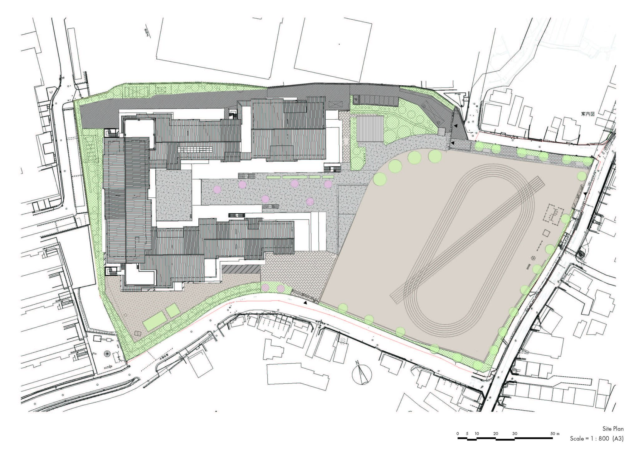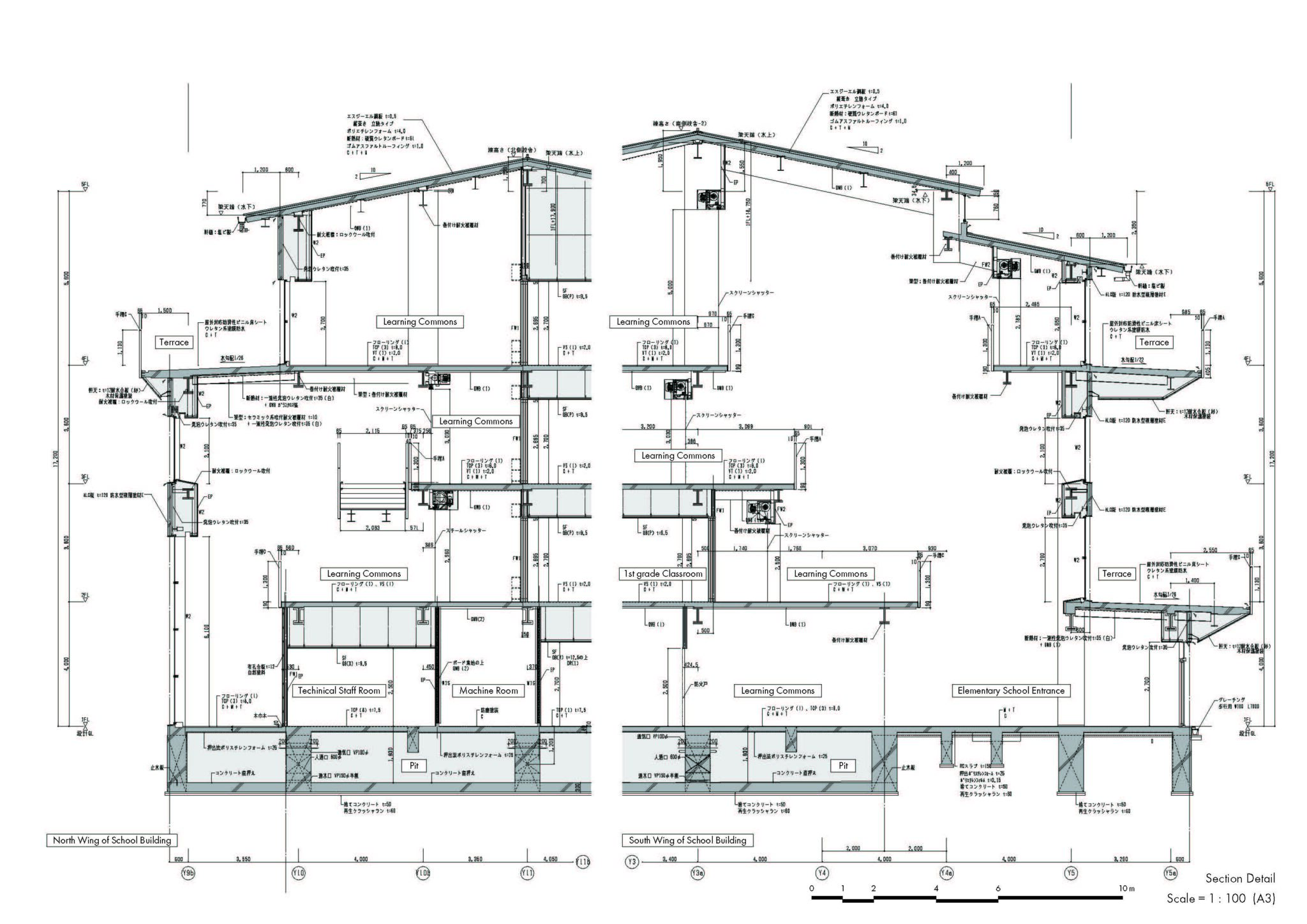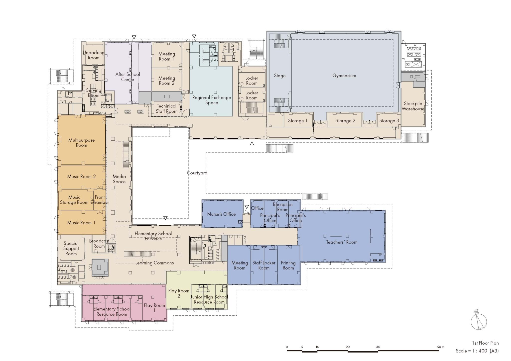 The school is a new symbol of the community. It houses two elementary schools and a junior high school. The elementary school and junior high school buildings face each other along the north-south axis. The west wing, which connects them, is a U-shaped layout for special classrooms. The building’s form creates an intimate courtyard which is open for the community to use.