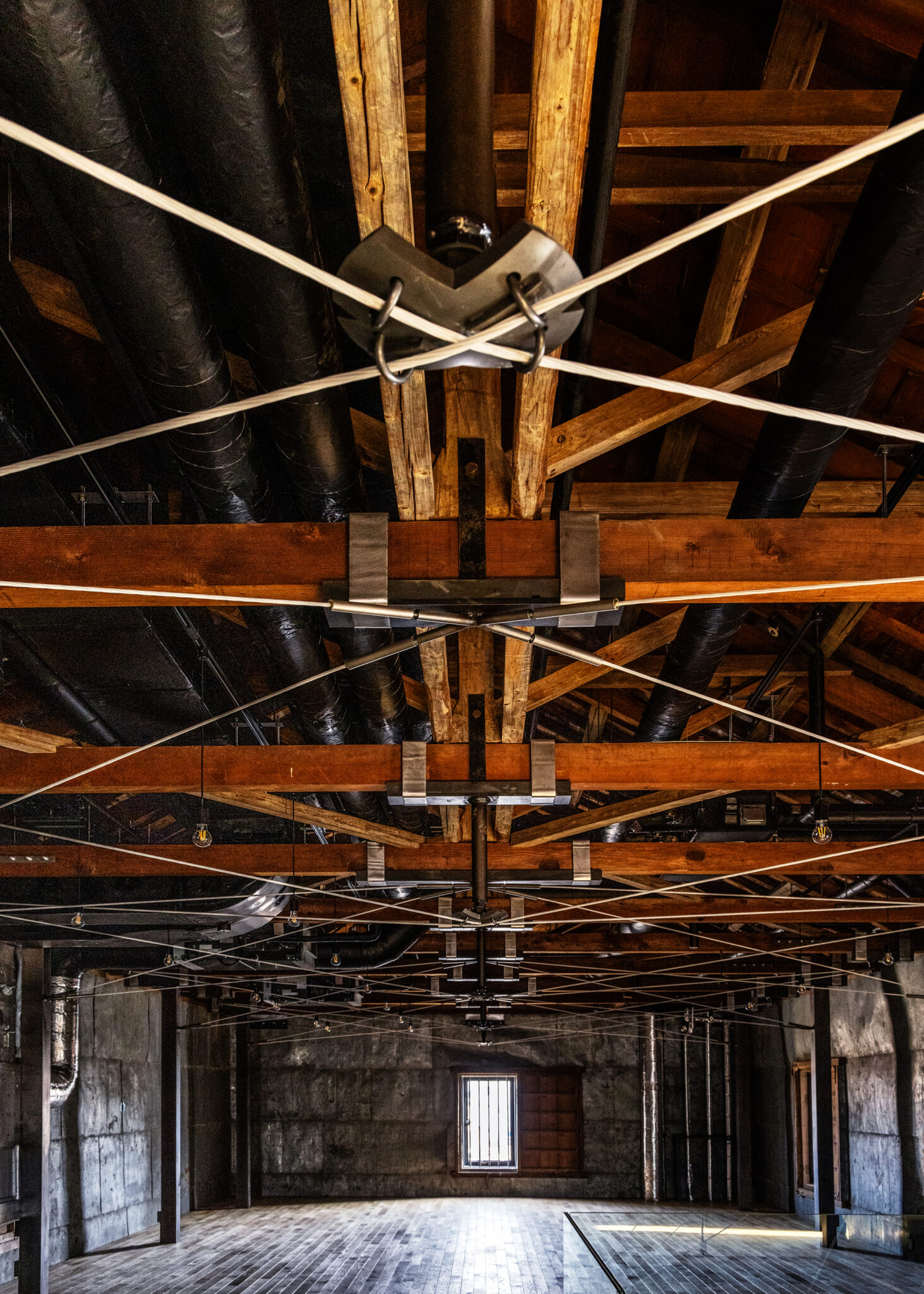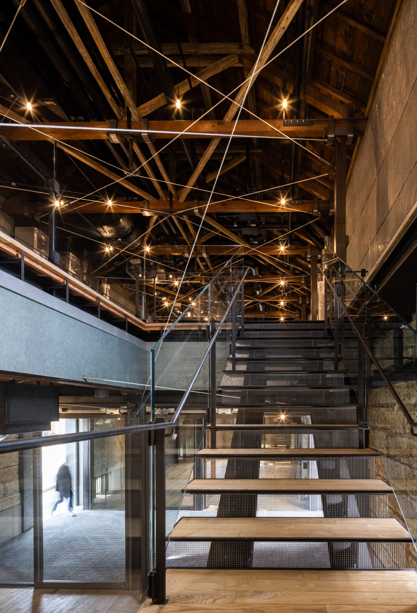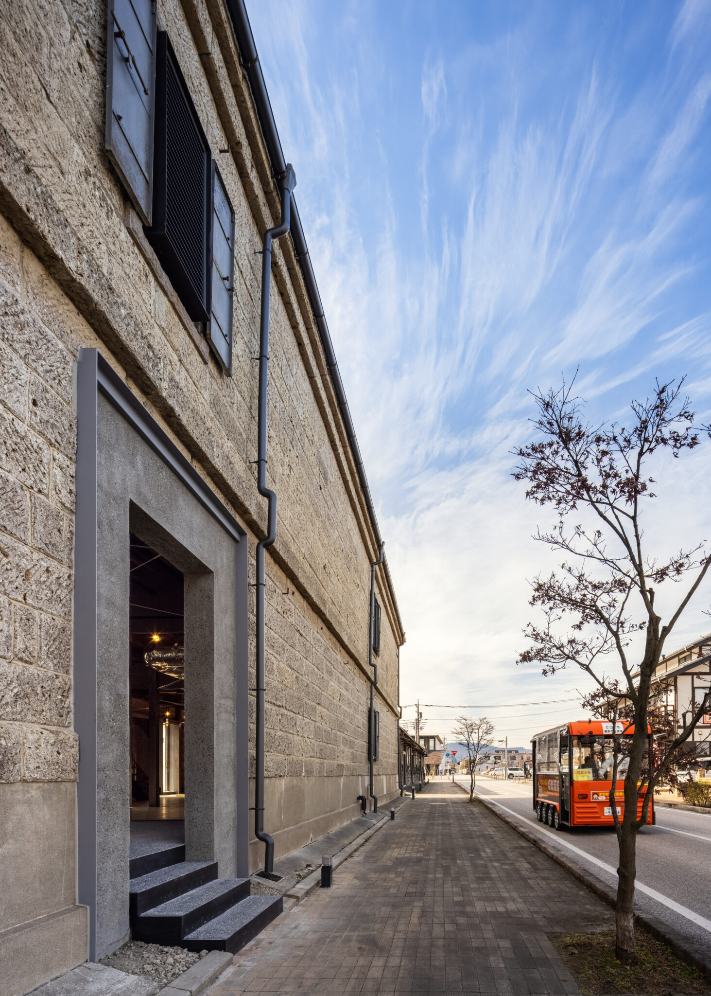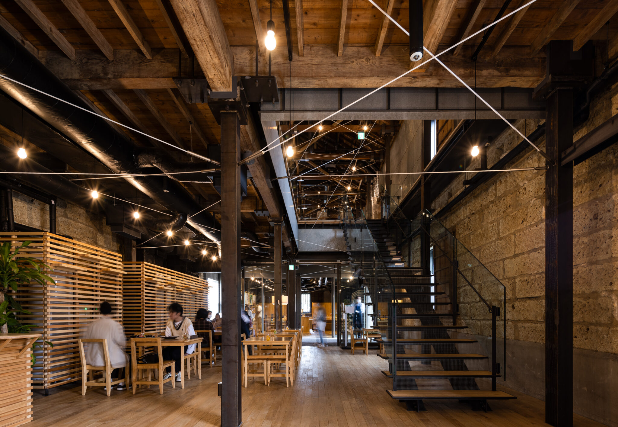 Warehouse No.2 (completed in 1923), a masonry structure built of Ōya stone, was given a three-dimensional seismic reinforcement system using CFRP and joints fabricated with 3D printing, extending across multiple floors like a form of spatial ayatori (cat’s cradle). This intervention introduces a sense of dynamic flow and lightness — qualities well suited to its new use as a café — into what might otherwise be a static masonry space.