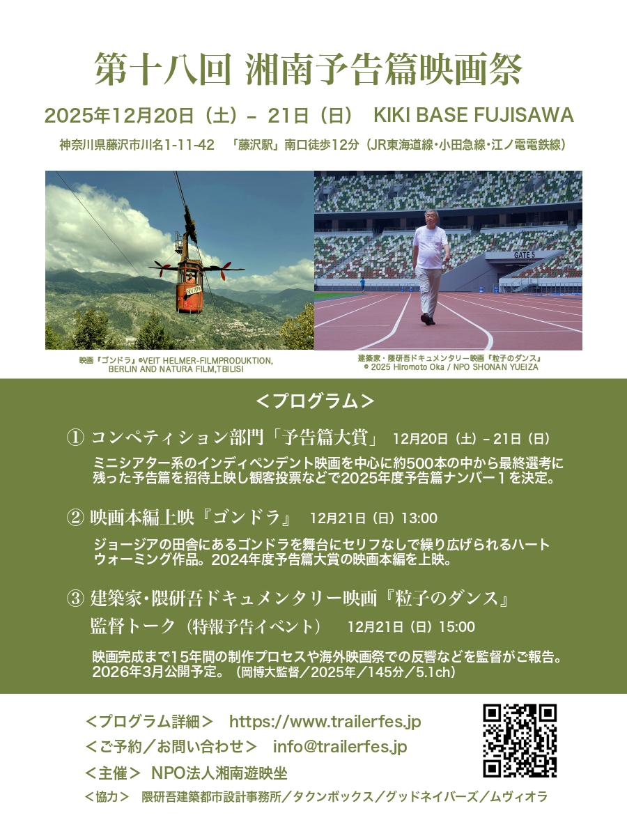 この度、NPO法人湘南遊映坐が主催する第18回湘南予告篇映画祭にて、隈研吾ドキュメンタリー映画『粒子のダンス』の特報イベントが開催されます。