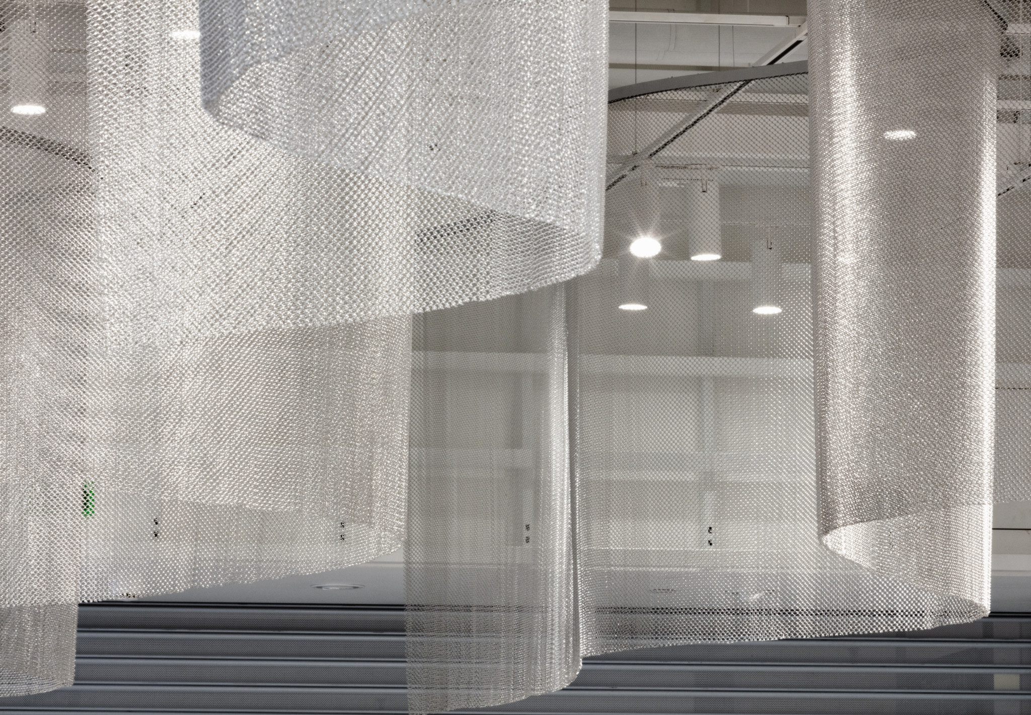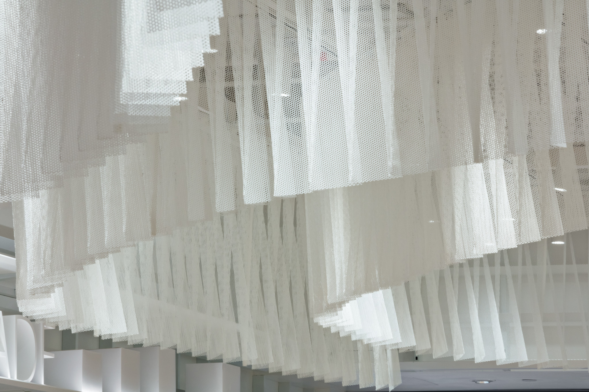 透ける三軸織物・アルミリングメッシュ・簾等、異なる素材を用いて「光」をデザインし、それぞれの部屋に独特の空気感を与えた。
