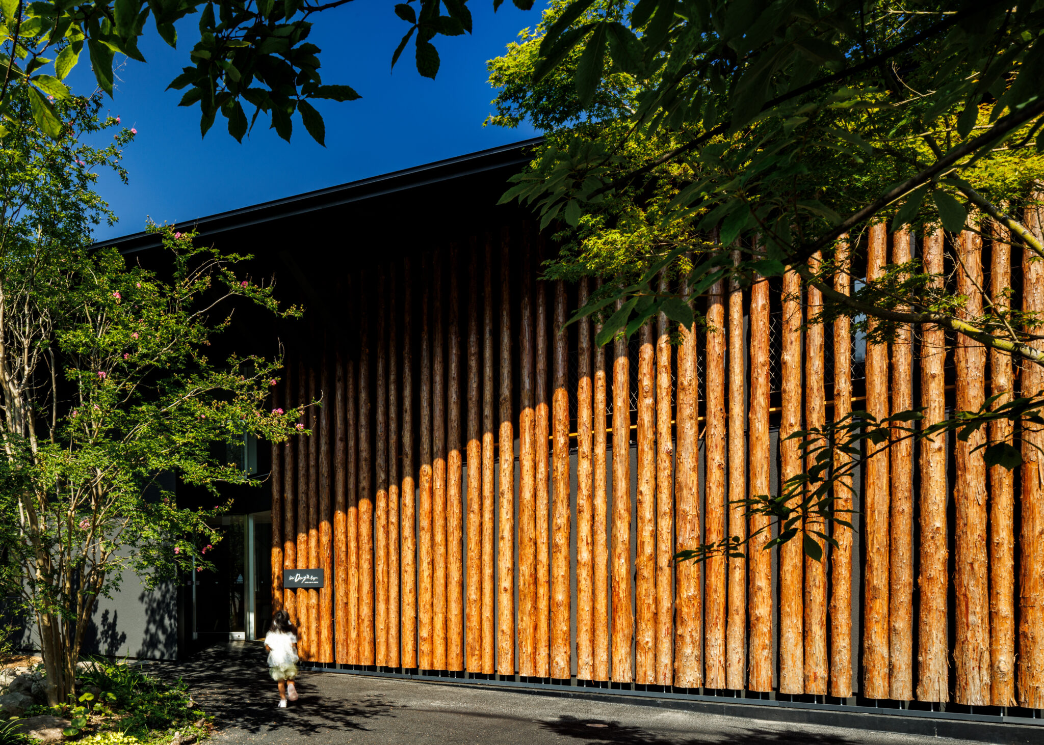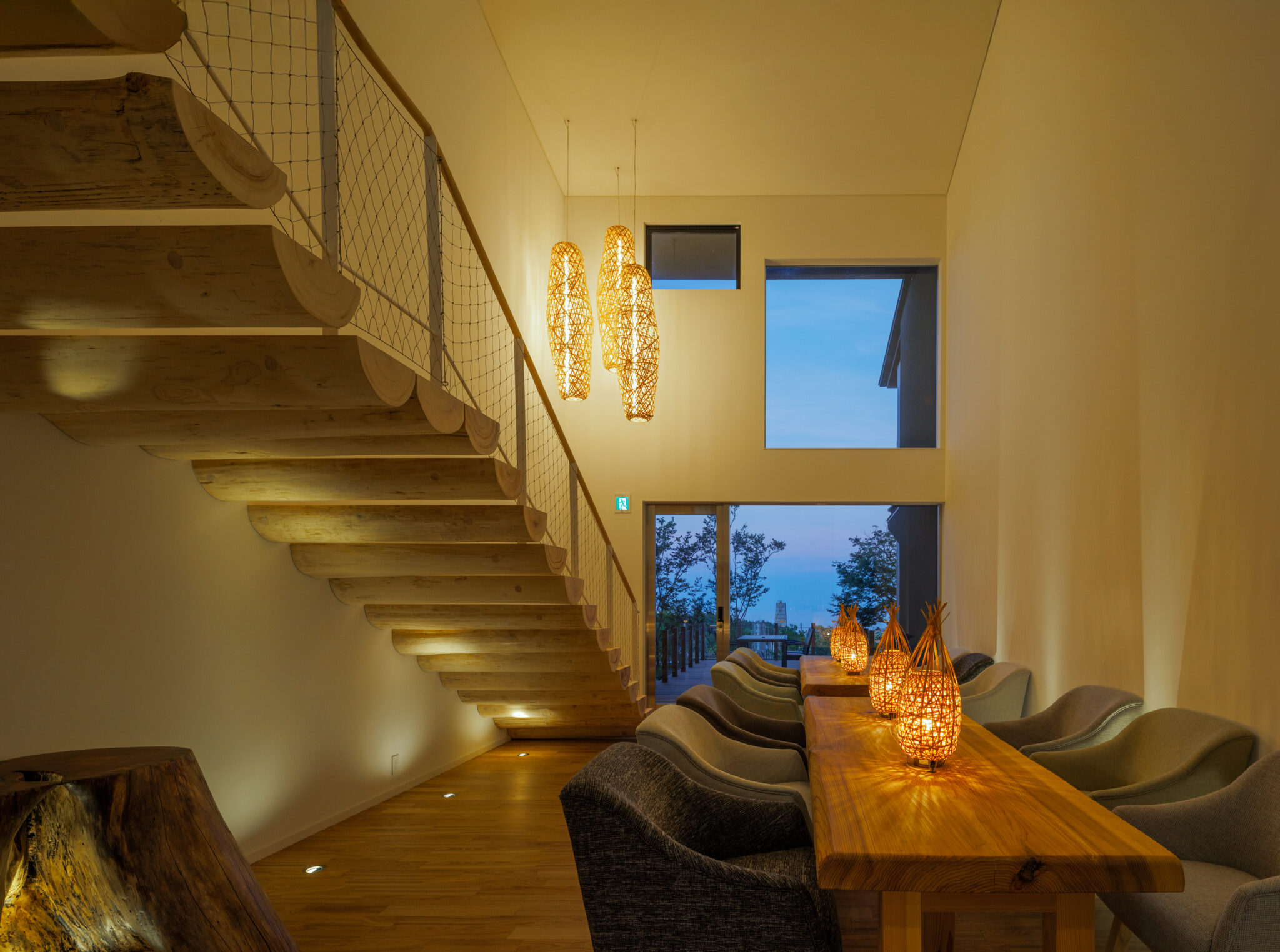 別府湾を目の前にのぞむ丘の上に、地元のヒノキ丸太や大分の特産である竹を用いて、かくれ家のようなホテルをデザインした。
