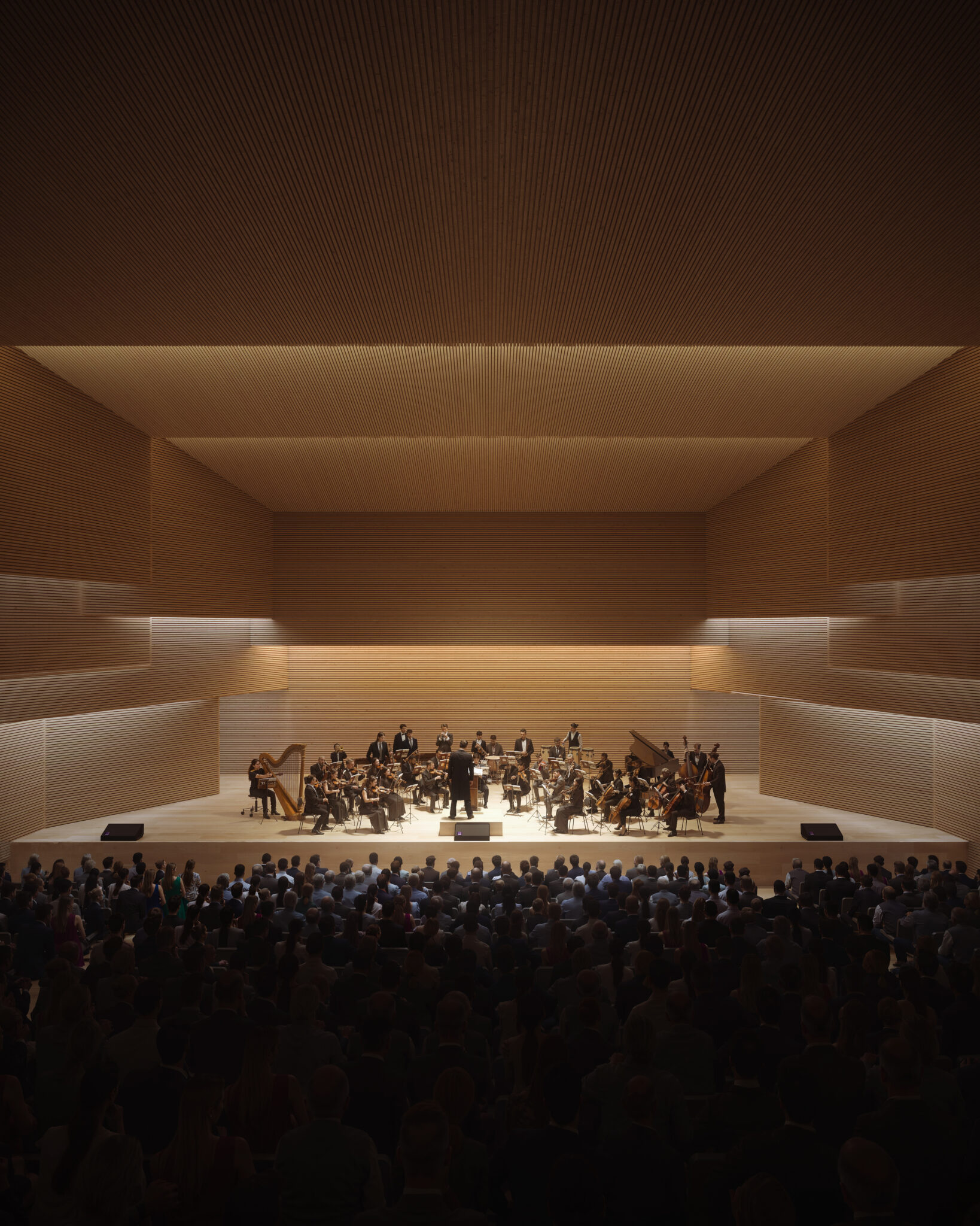 The structure adopts a hybrid system combining CLT/LVL timber elements with steel, reflecting KKAA’s commitment to sustainability and the expressive use of natural materials.