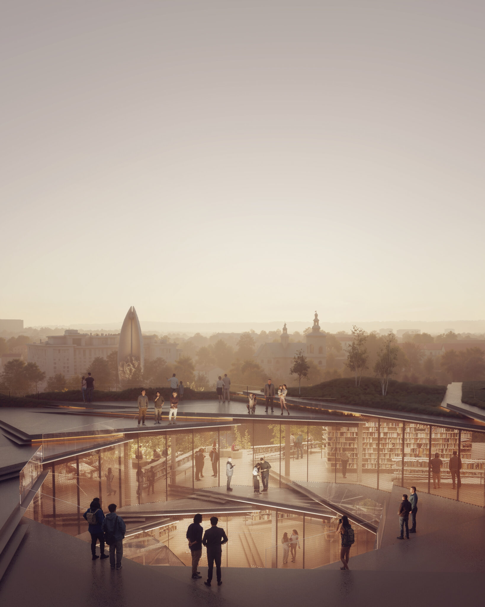 At the heart of the design lies the library space, spiraling around a skylit central atrium that vertically connects all levels. The continuity of the spiral floors creates a dynamic and unified spatial experience, inviting visitors to move fluidly through the building. Verdant terraces ascend from the ground floor to rooftop viewing decks, offering accessible green spaces along the spiral path.