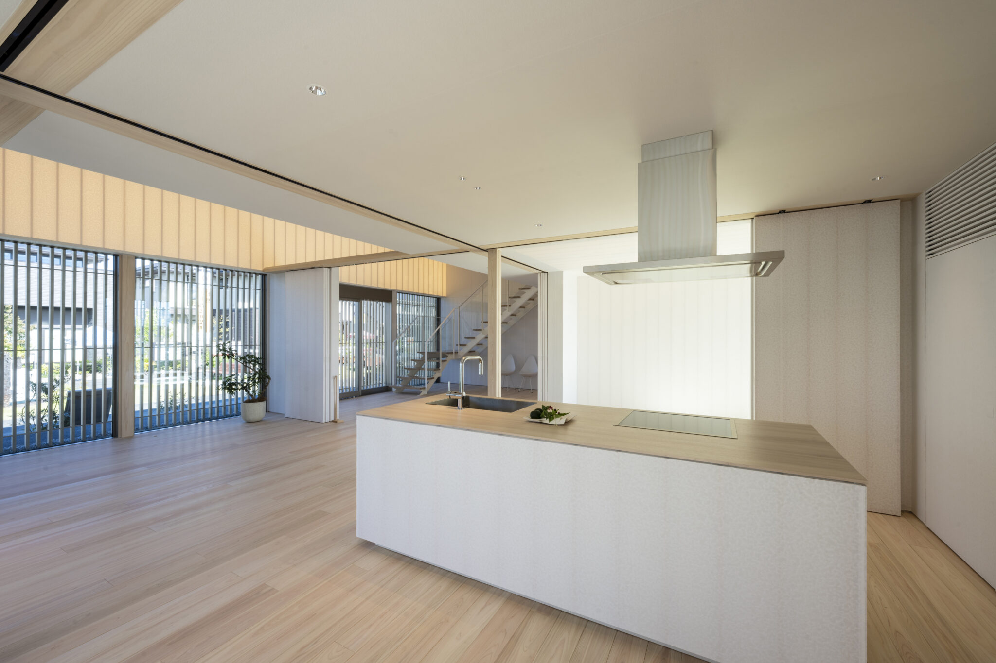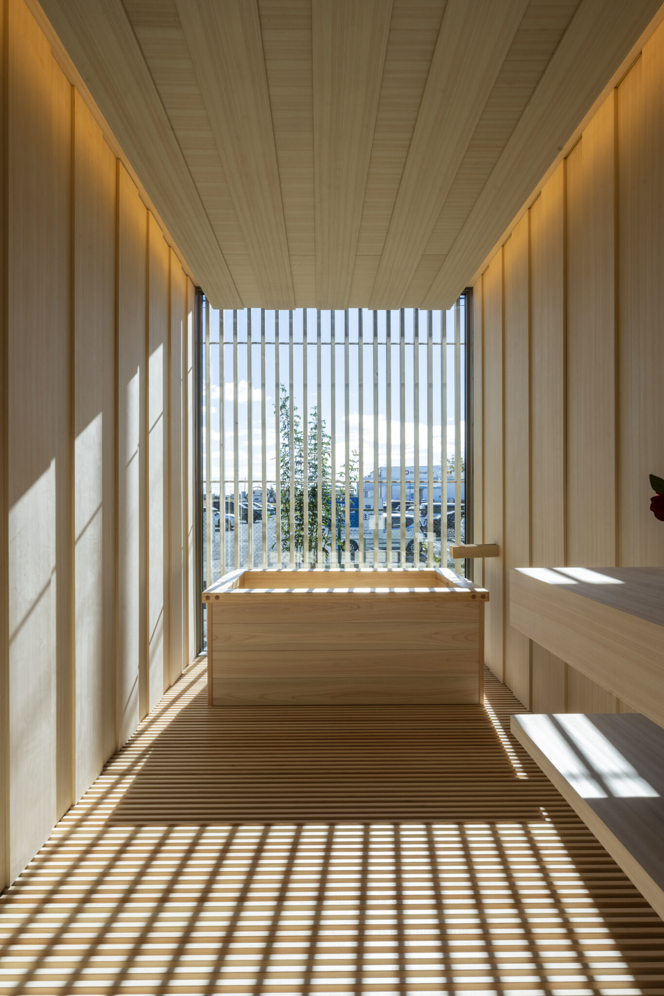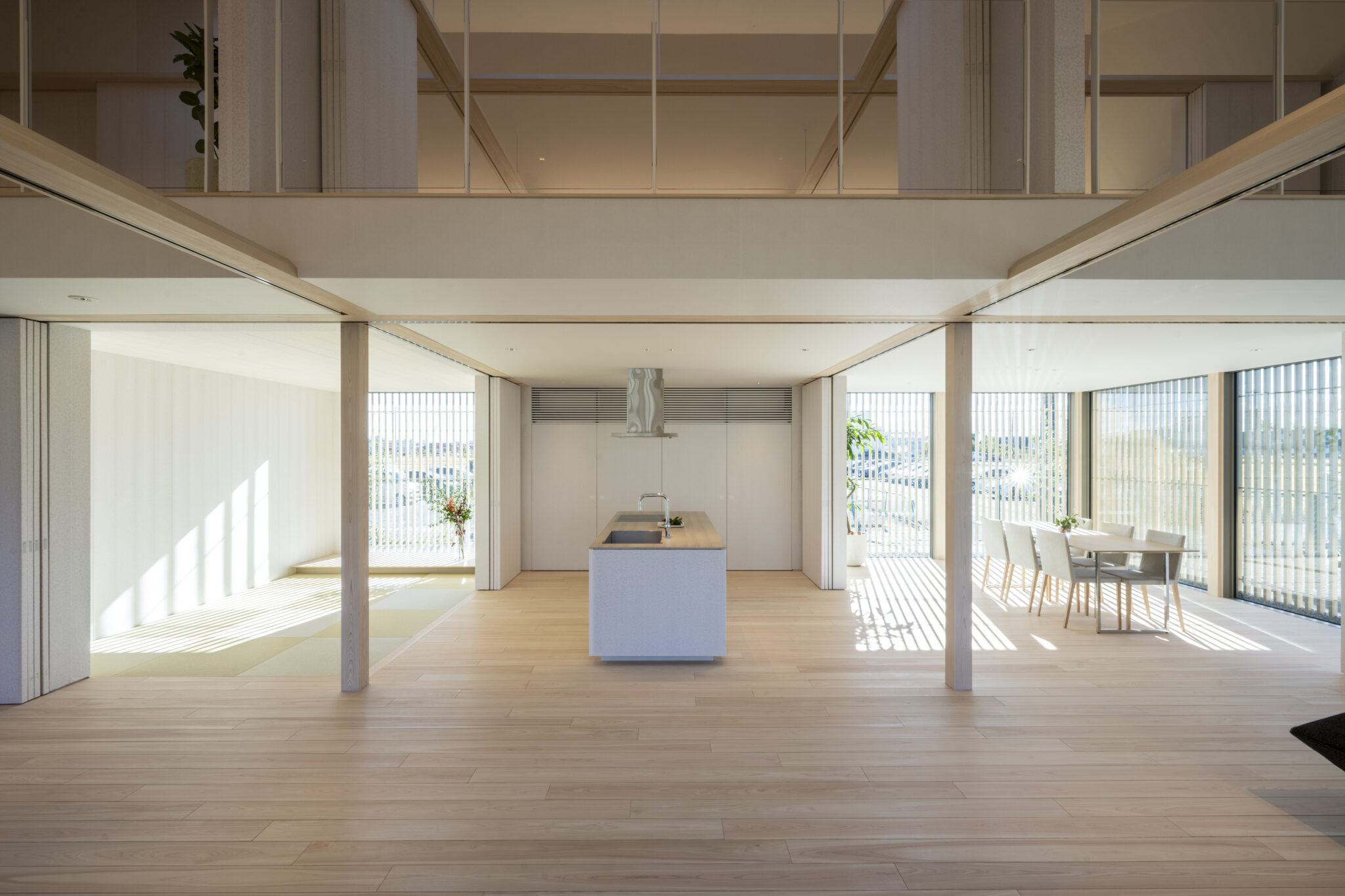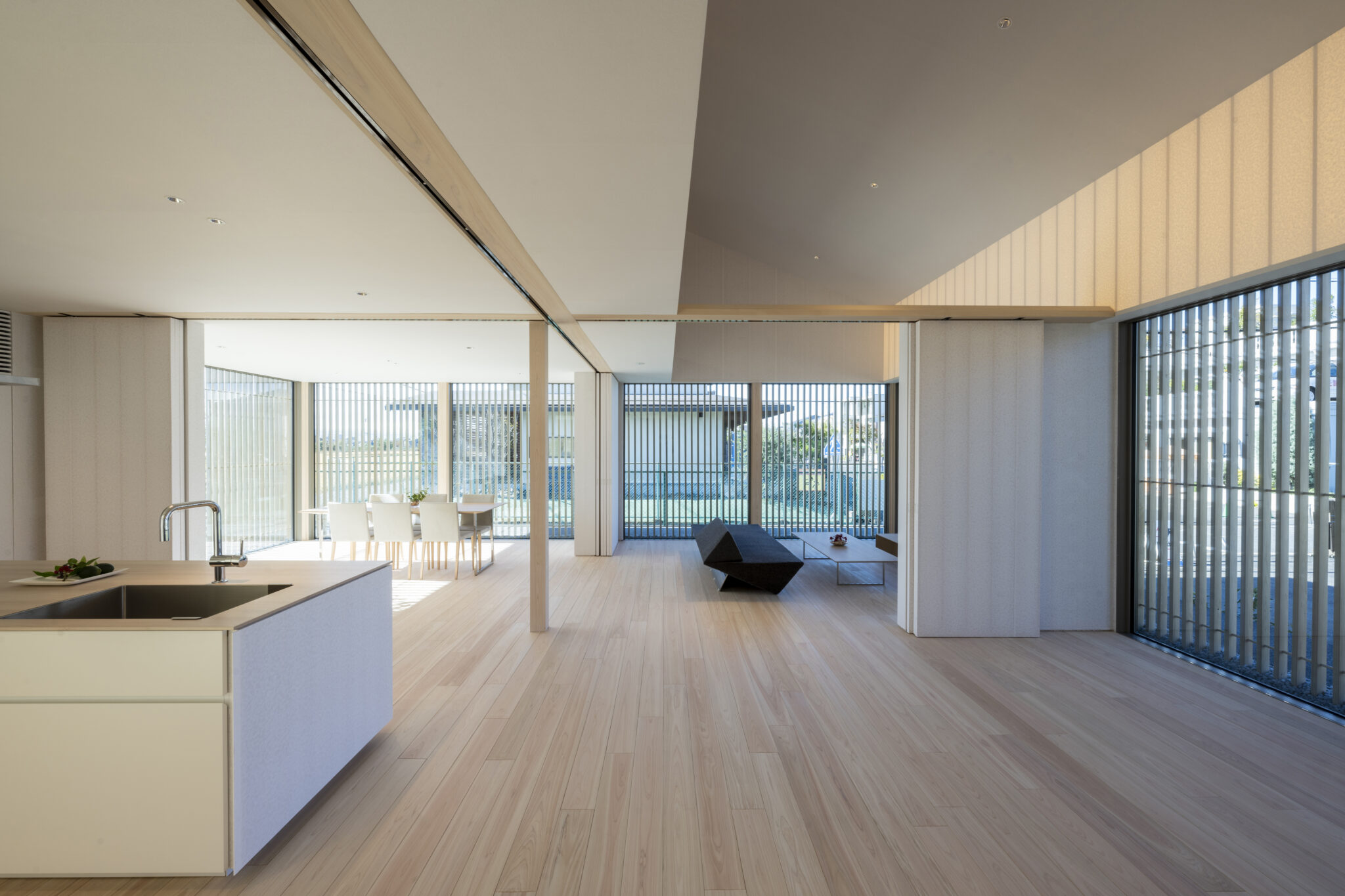 日本の民家の伝統的な知恵である「田の字プラン」と、可動パーティションを、光と風を通す60×30の断面寸法の繊細なヒノキスクリーンで建物全体を覆うことで、伝統建築の格子戸のもつ透明感を建築全体へと拡張した。