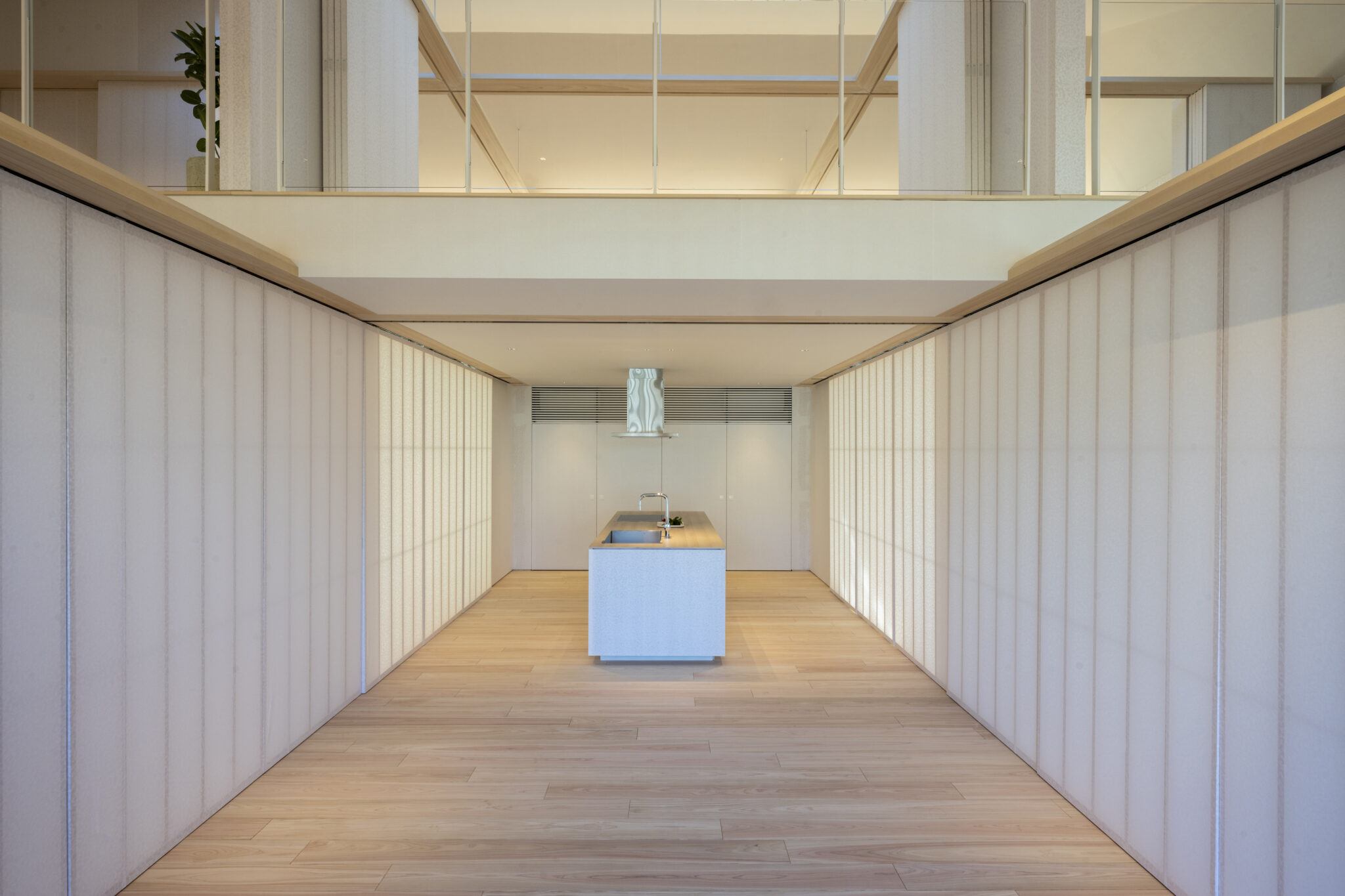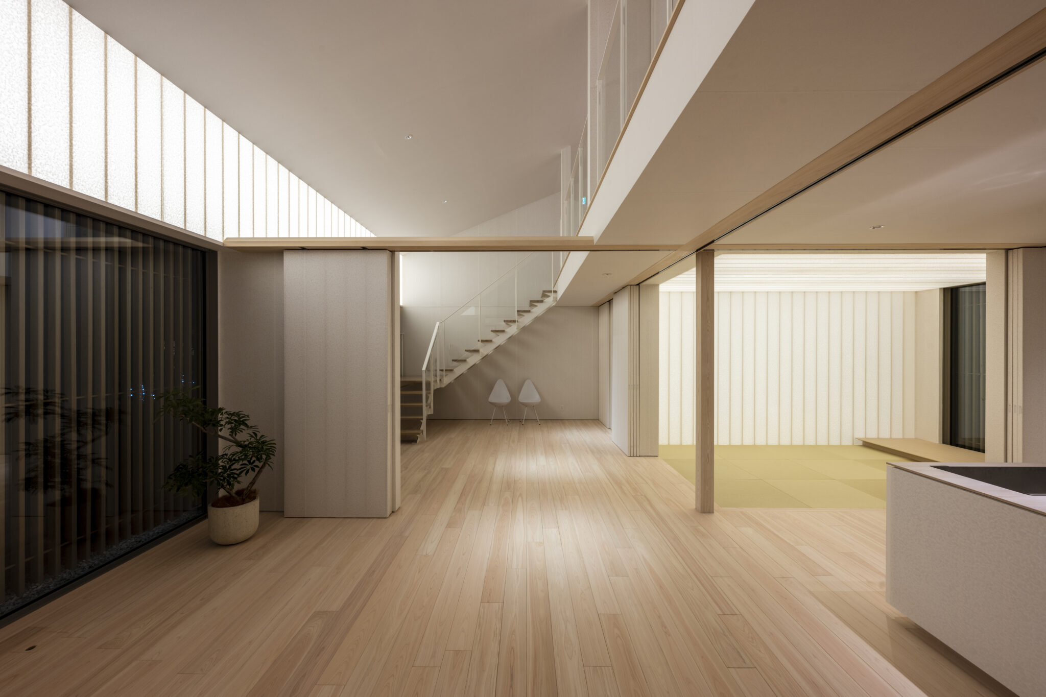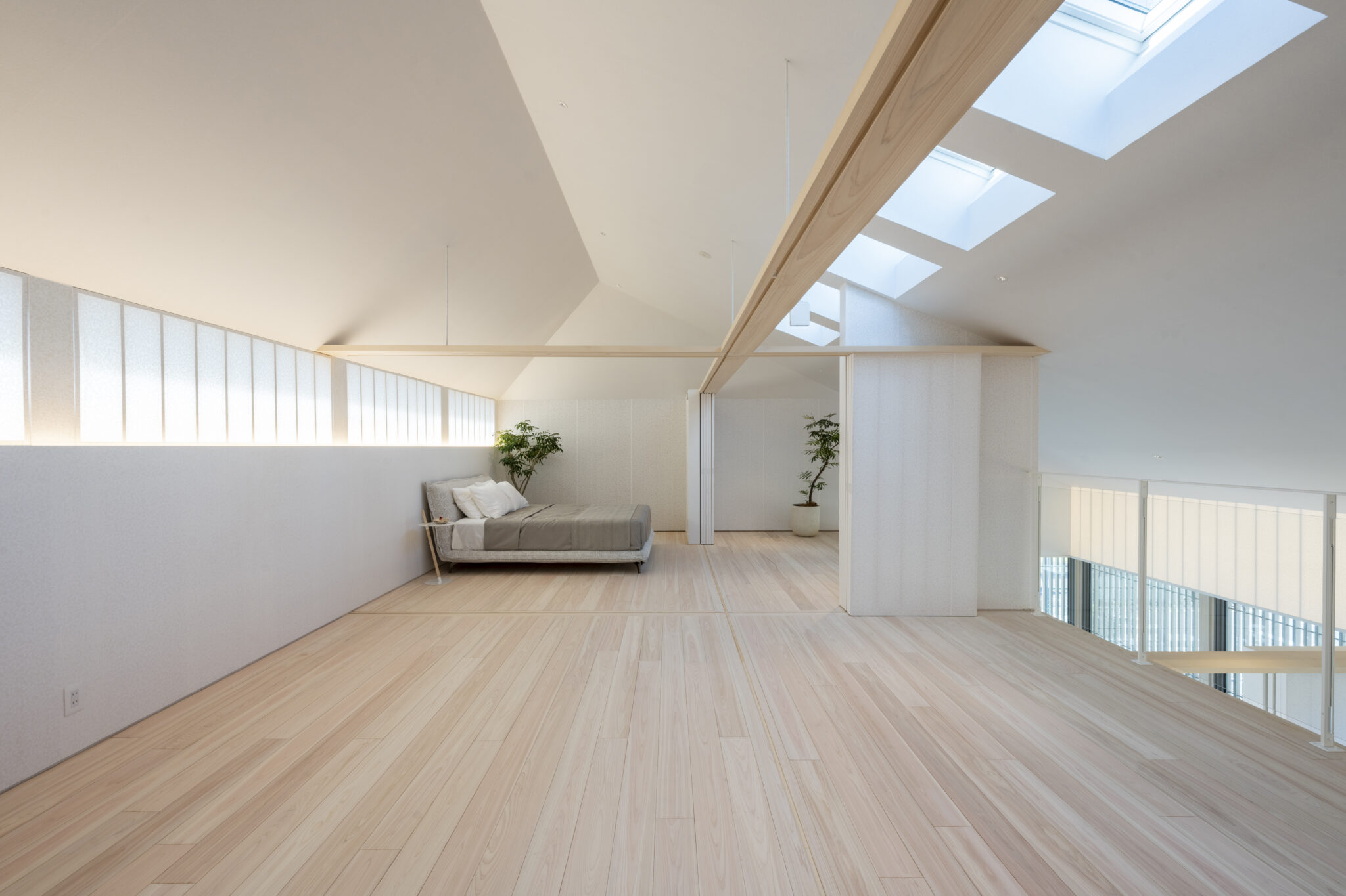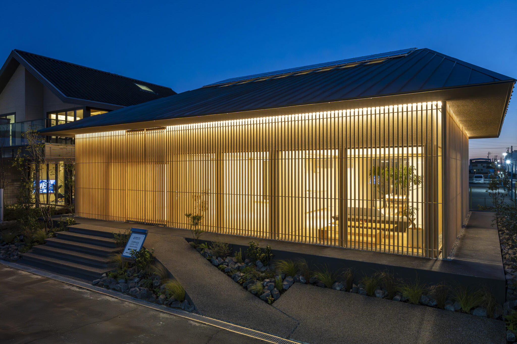 日本の民家の伝統的な知恵である「田の字プラン」と、可動パーティションを、光と風を通す60×30の断面寸法の繊細なヒノキスクリーンで建物全体を覆うことで、伝統建築の格子戸のもつ透明感を建築全体へと拡張した。