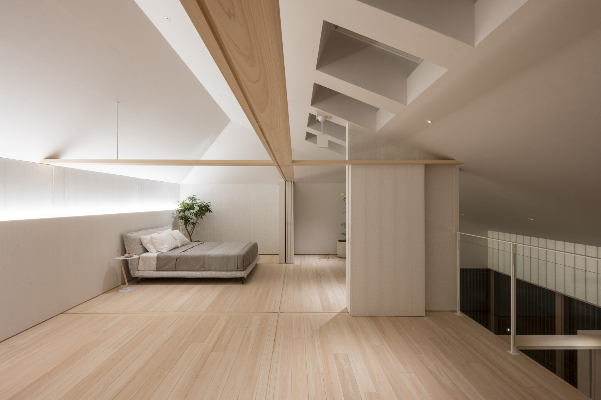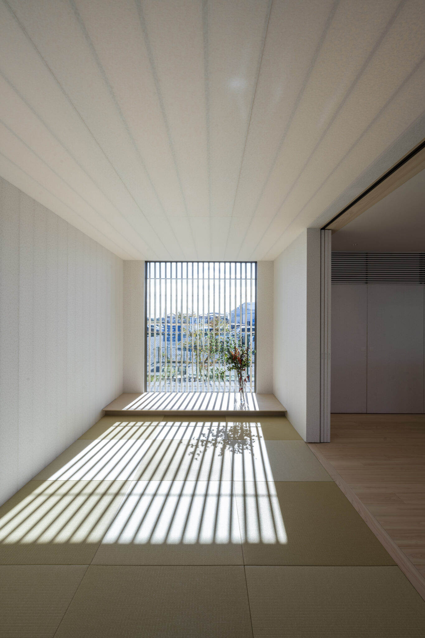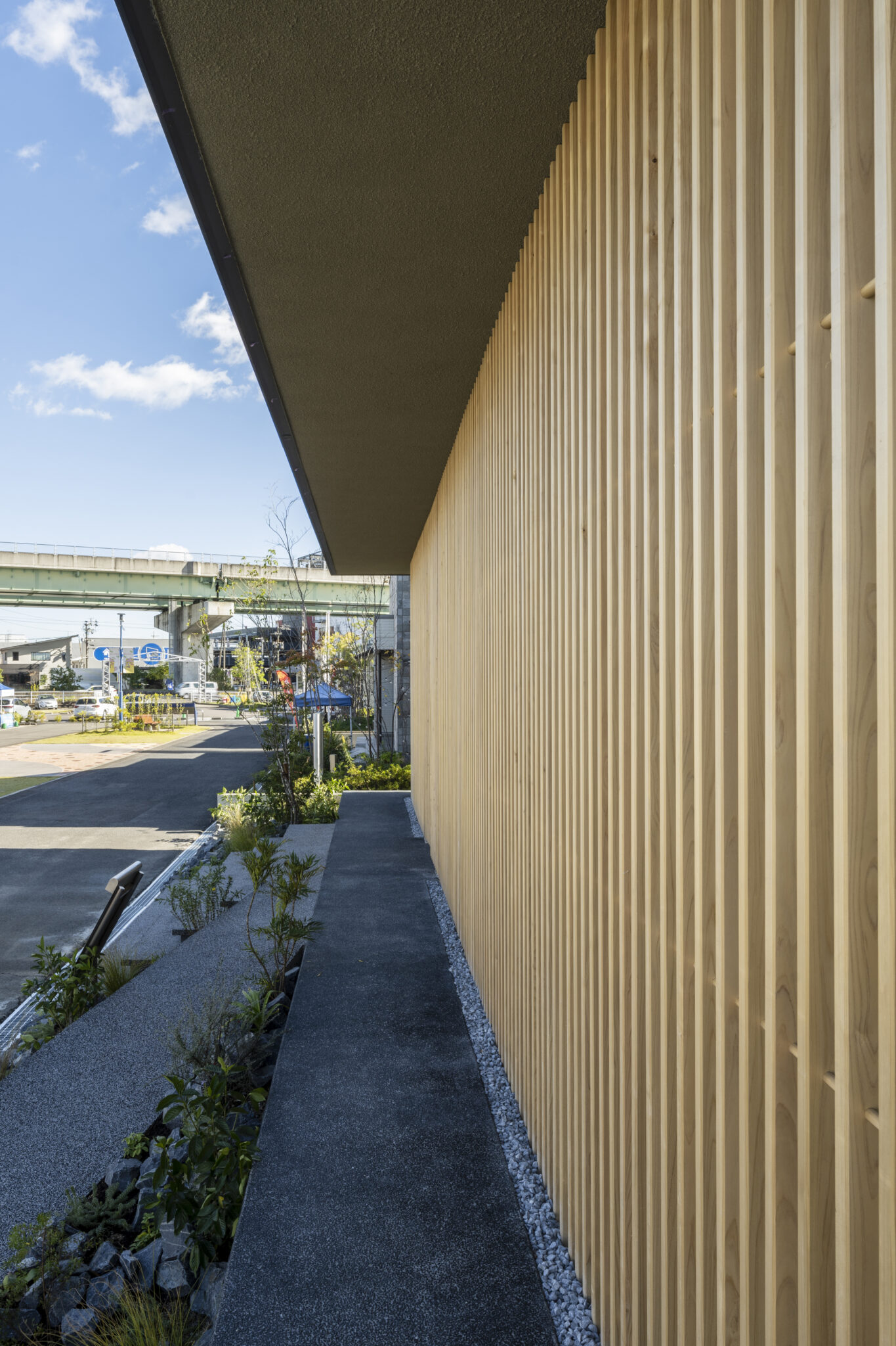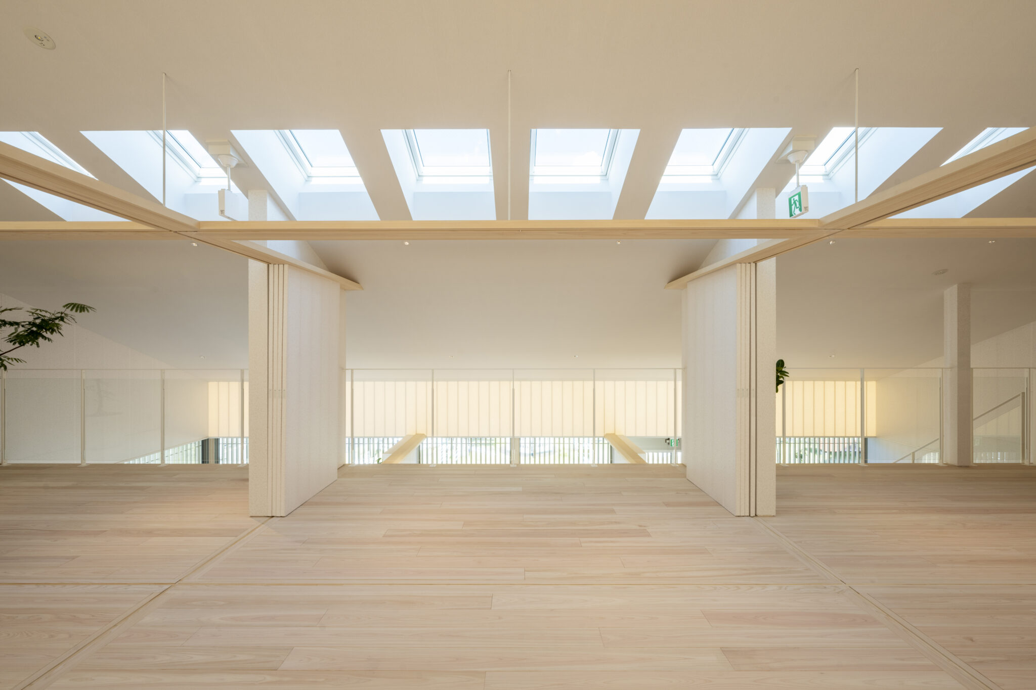 日本の民家の伝統的な知恵である「田の字プラン」と、可動パーティションを、光と風を通す60×30の断面寸法の繊細なヒノキスクリーンで建物全体を覆うことで、伝統建築の格子戸のもつ透明感を建築全体へと拡張した。