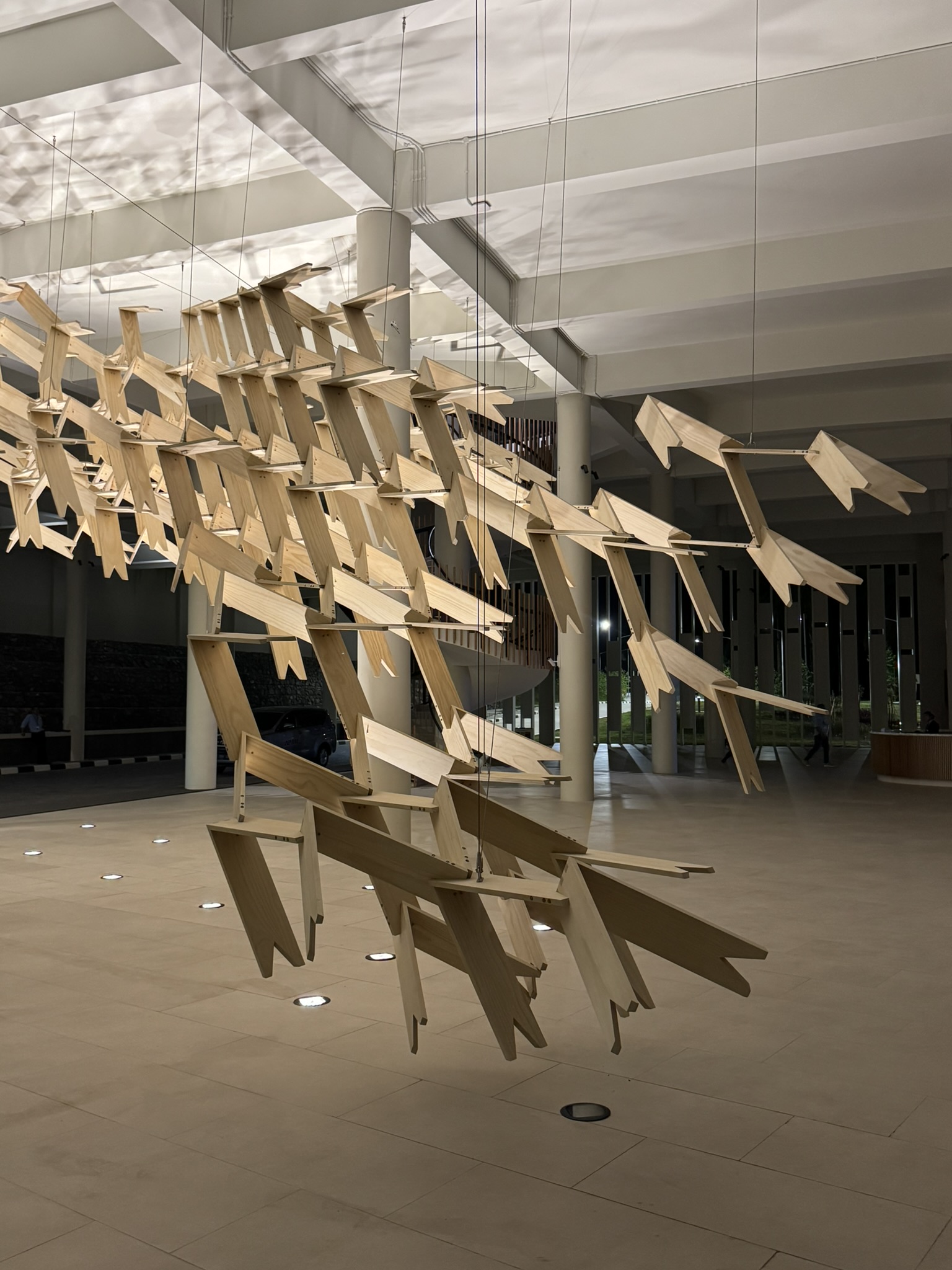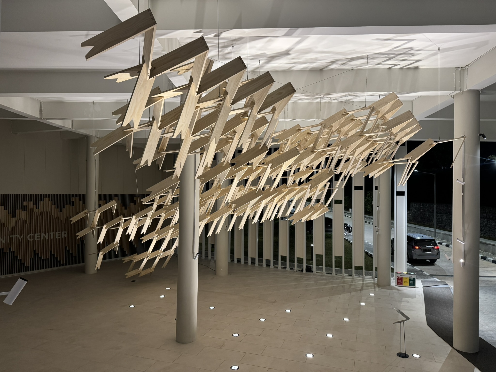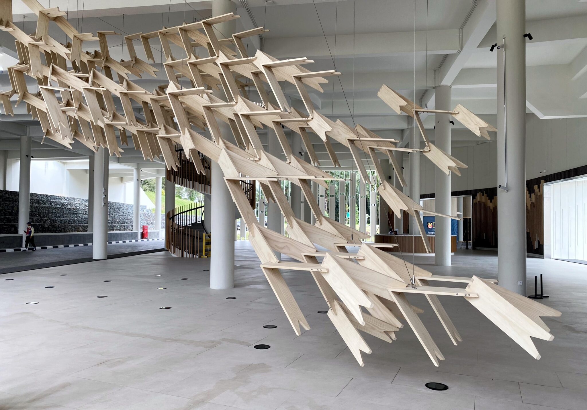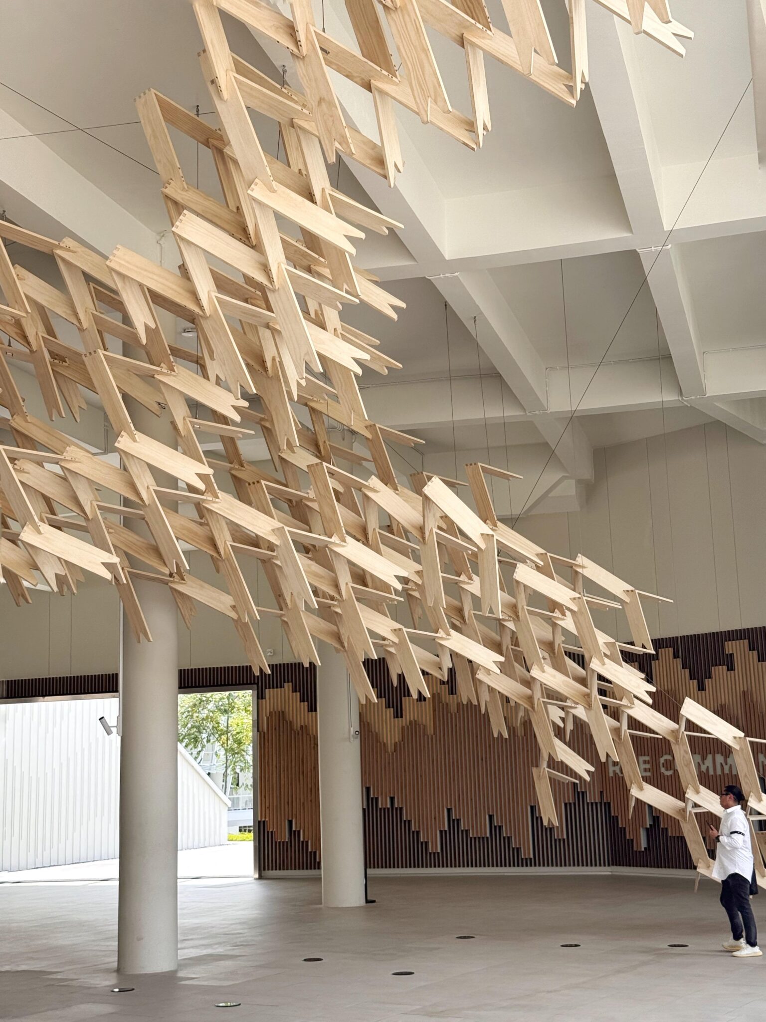The installation is realized through an abstract interpretation of the eagle’s feathers, translated into layers of wooden elements that drift and overlap like clouds. Cypress wood, with its warmth, grain, and natural imperfection, is treated as a living material—an extension of the natural environment rather than a separation from it. The structure is composed of Tsumiki wooden modules, allowing small, human-scale components to assemble into a larger collective whole. This approach reflects a philosophy in which architecture is not imposed, but patiently formed through accumulation, rhythm, and collaboration.