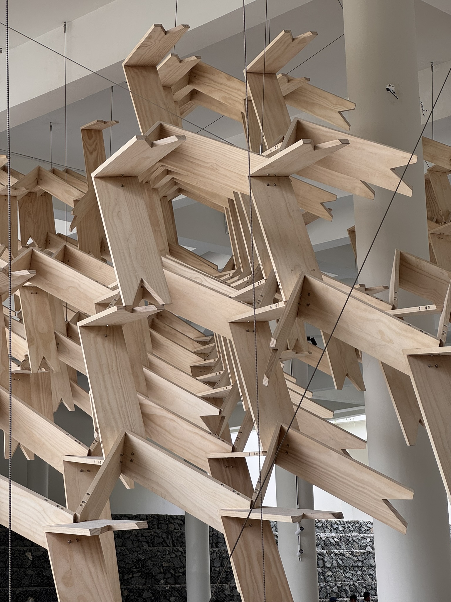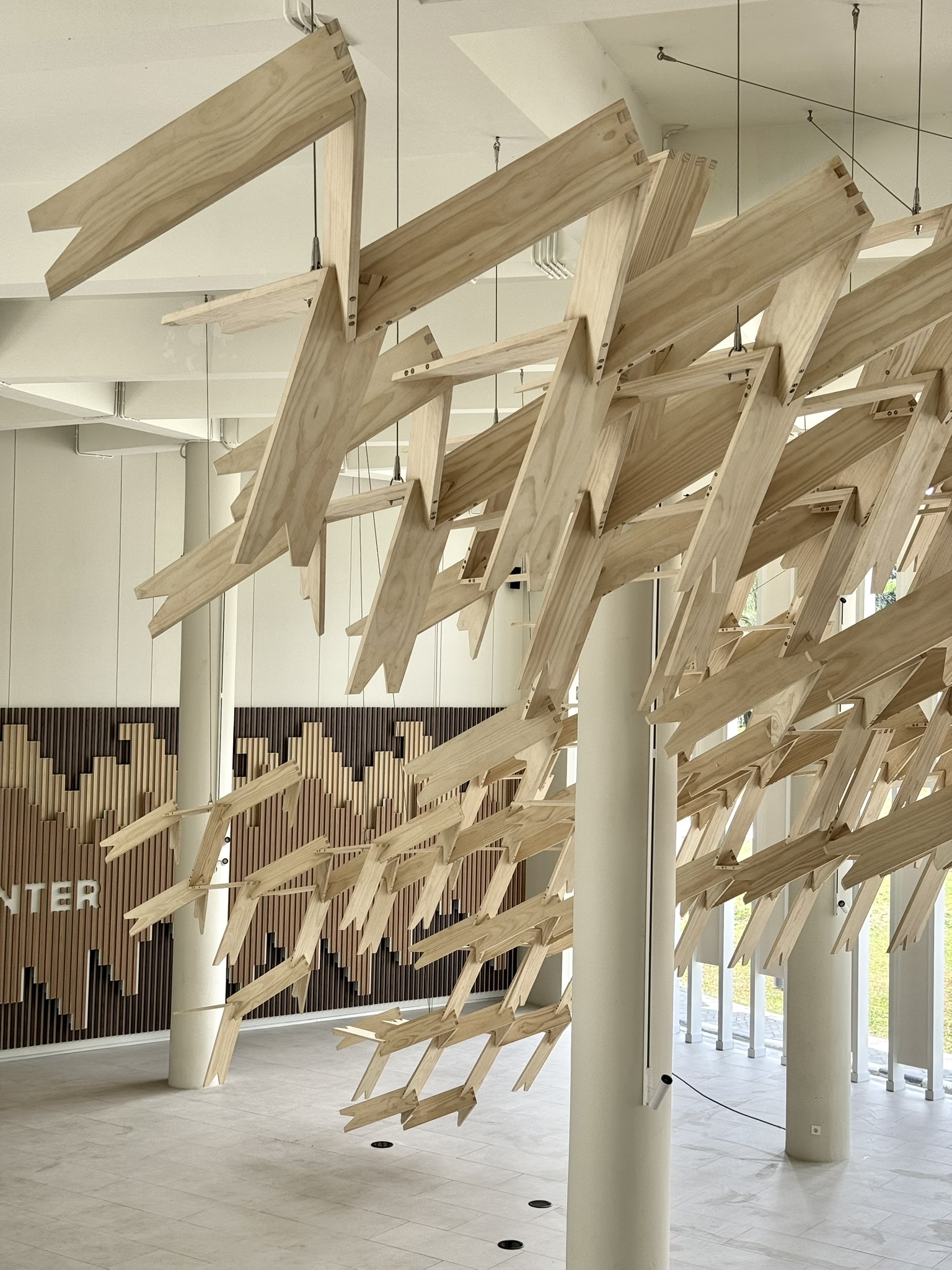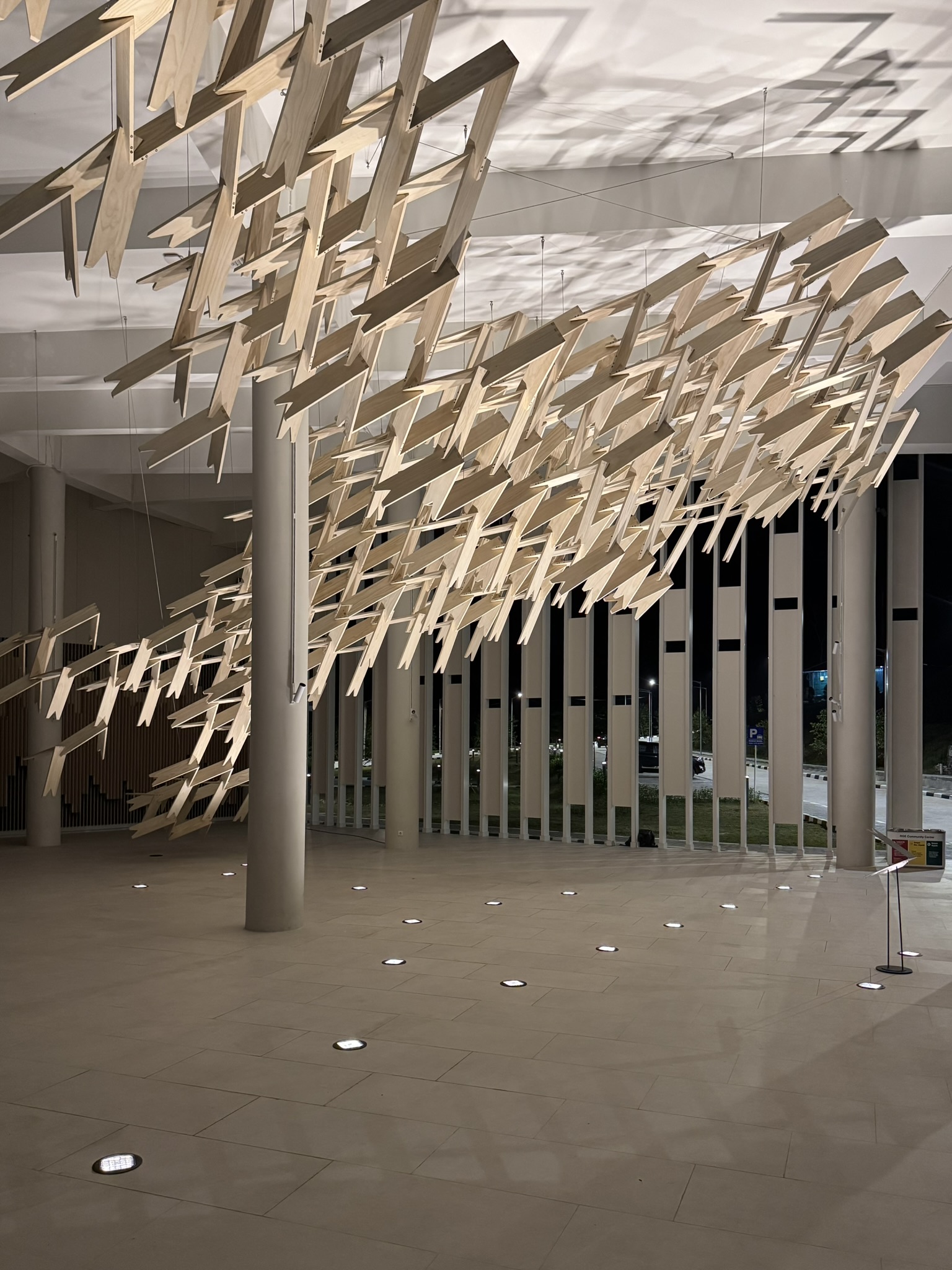 The installation is realized through an abstract interpretation of the eagle’s feathers, translated into layers of wooden elements that drift and overlap like clouds. Cypress wood, with its warmth, grain, and natural imperfection, is treated as a living material—an extension of the natural environment rather than a separation from it. The structure is composed of Tsumiki wooden modules, allowing small, human-scale components to assemble into a larger collective whole. This approach reflects a philosophy in which architecture is not imposed, but patiently formed through accumulation, rhythm, and collaboration.