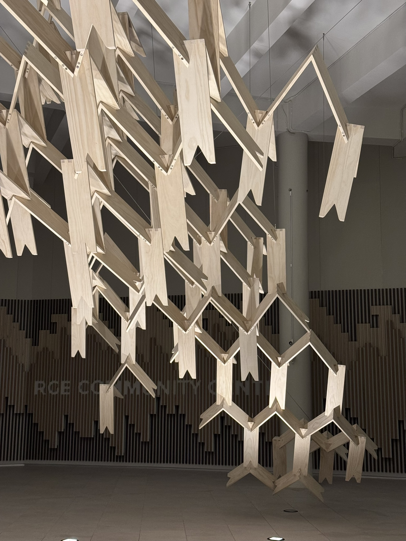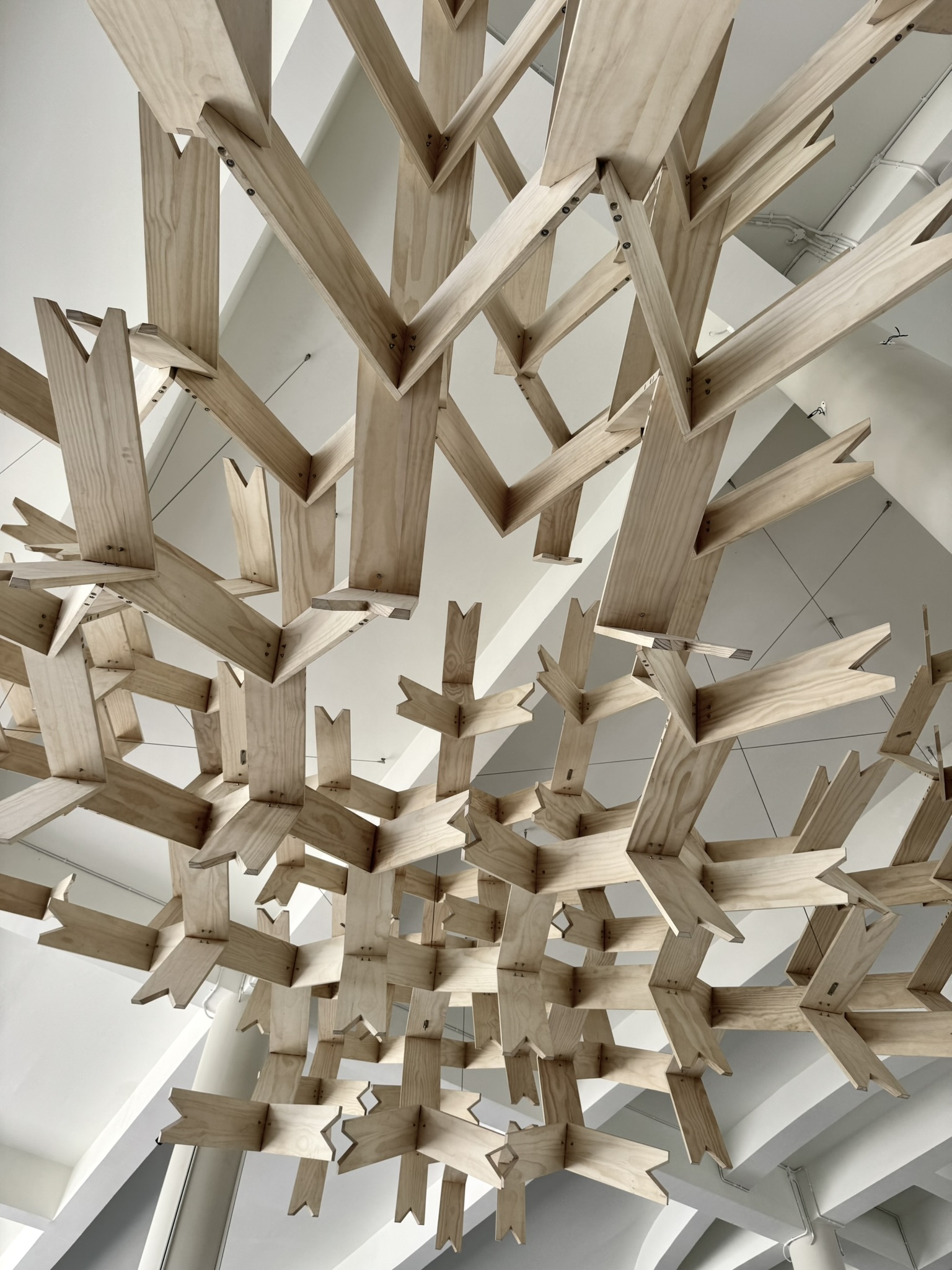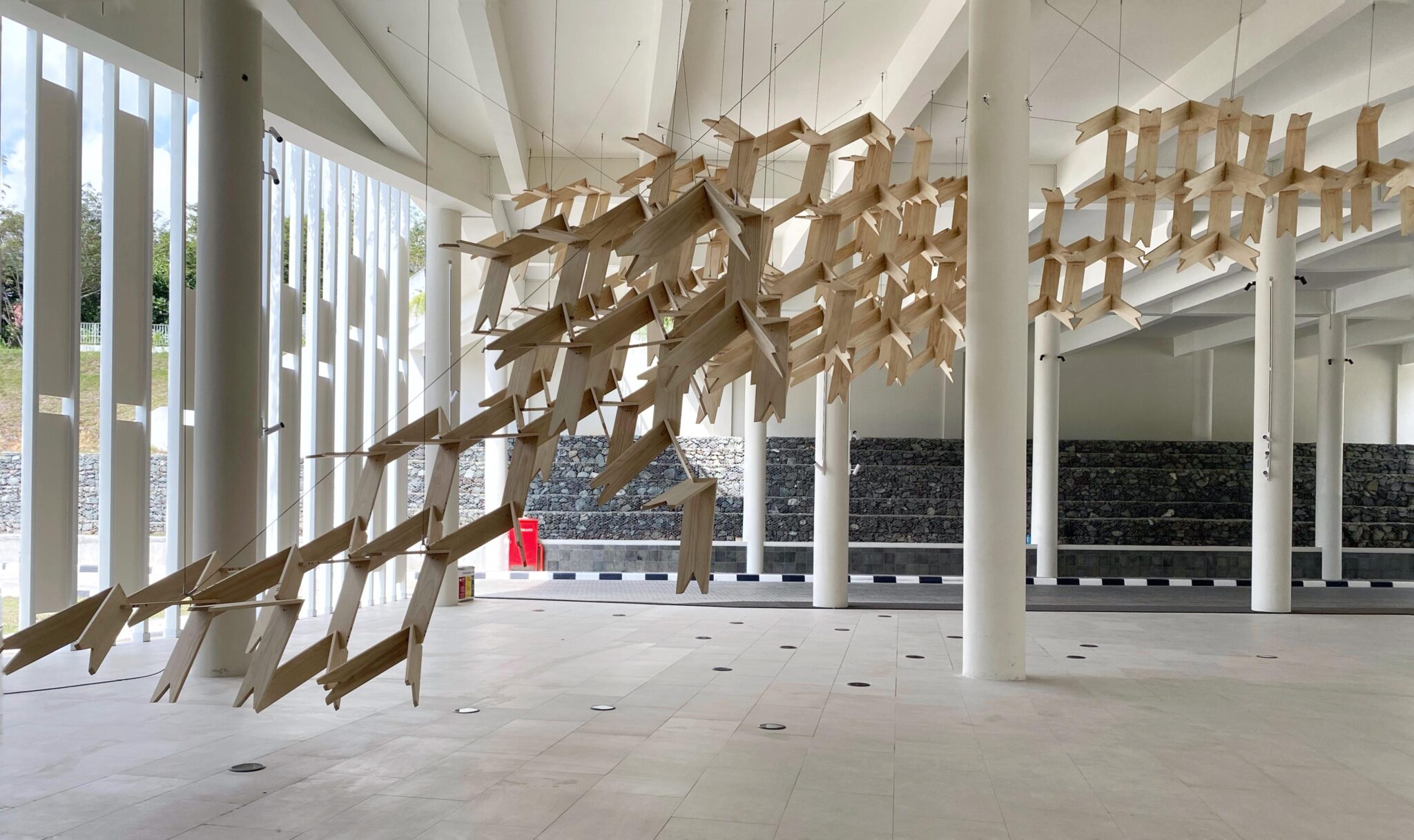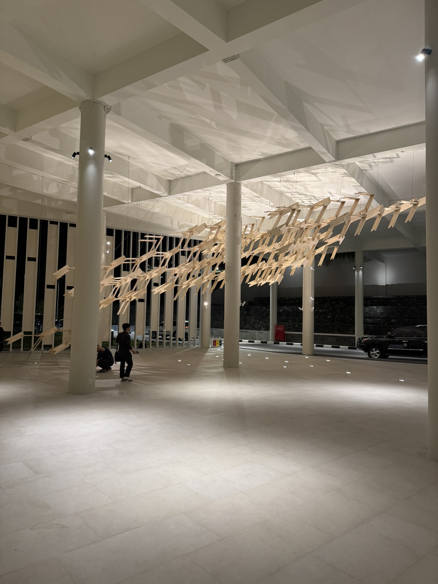 The installation is realized through an abstract interpretation of the eagle’s feathers, translated into layers of wooden elements that drift and overlap like clouds. Cypress wood, with its warmth, grain, and natural imperfection, is treated as a living material—an extension of the natural environment rather than a separation from it. The structure is composed of Tsumiki wooden modules, allowing small, human-scale components to assemble into a larger collective whole. This approach reflects a philosophy in which architecture is not imposed, but patiently formed through accumulation, rhythm, and collaboration.