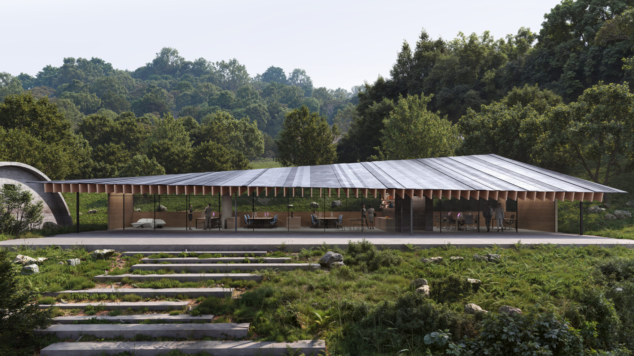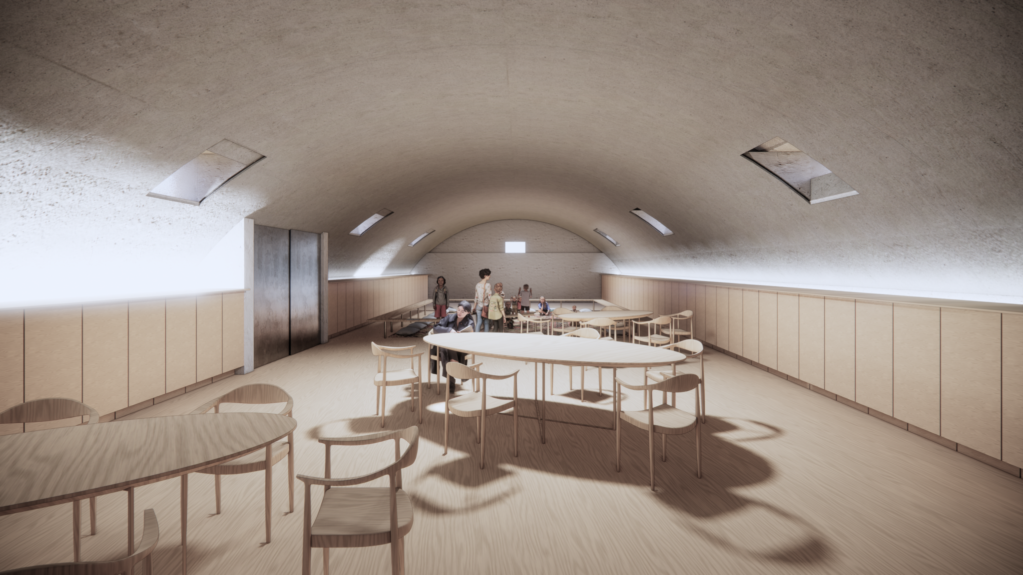The original site consisted of several storage buildings associated with twentieth-century military infrastructure. Their tectonic character—elongated volumes capped by arched metal roofs—provided the compositional foundation of the project and established the rhythm of its spatial development.