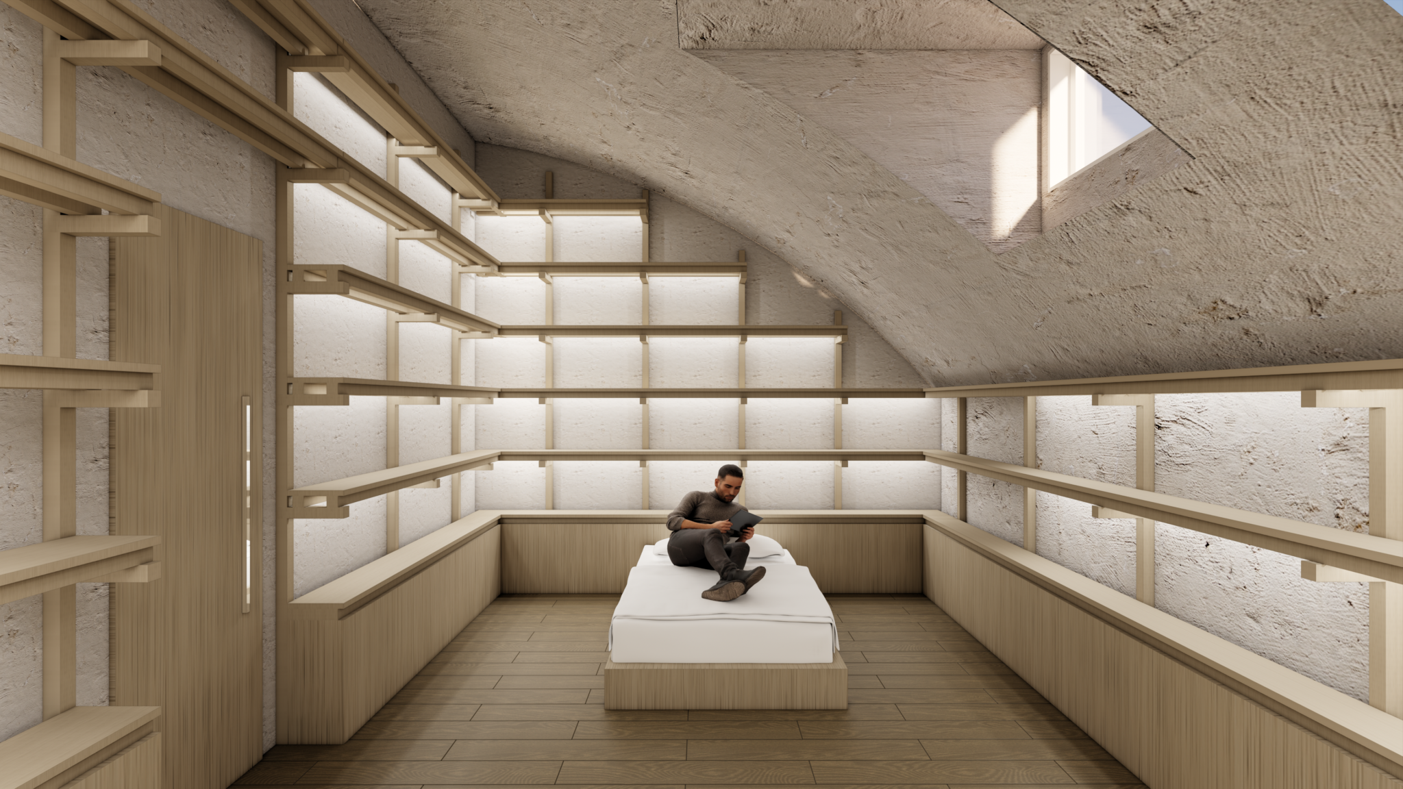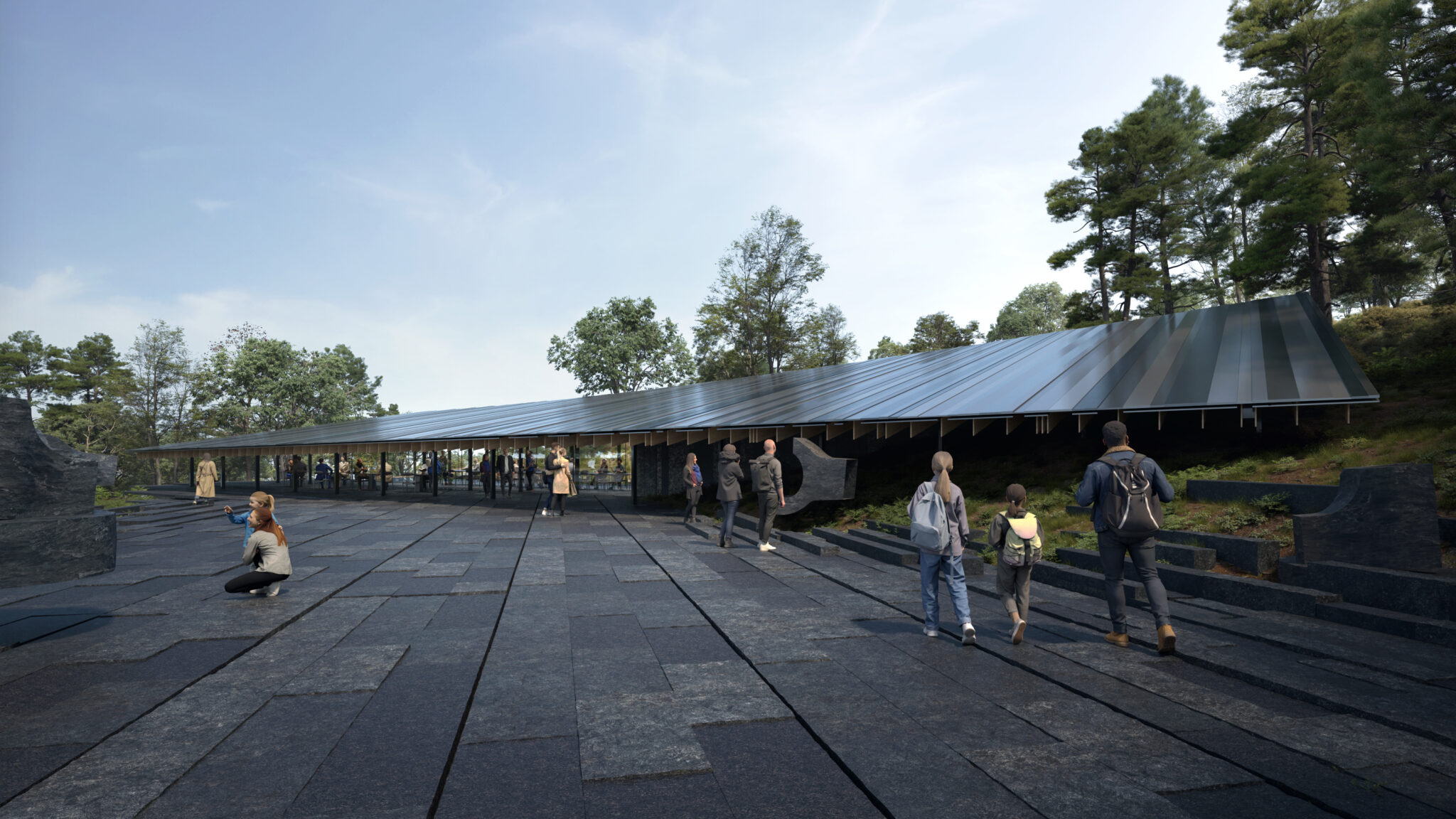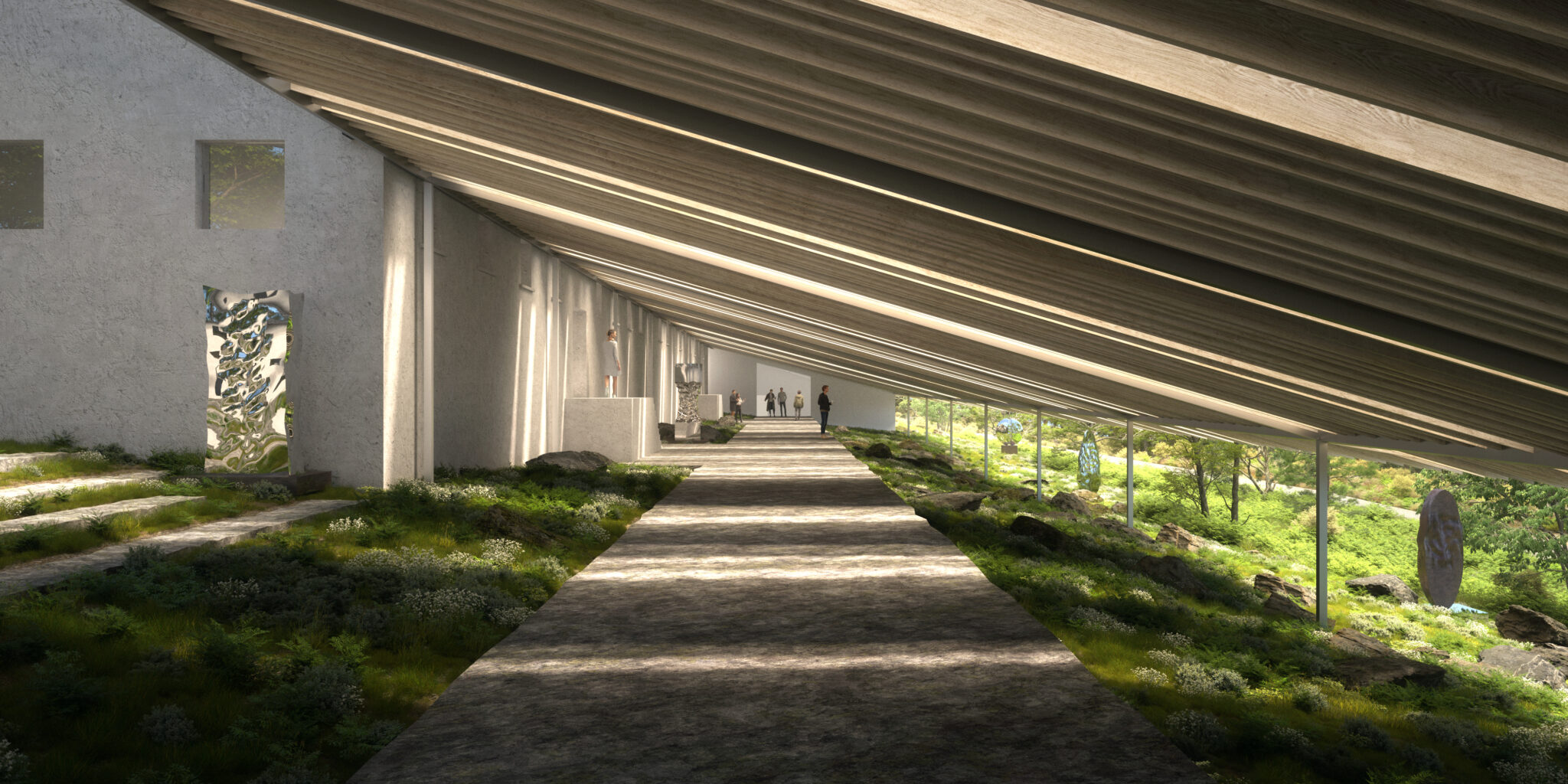 In contrast to the historic structures, the new architectural volumes appear as thin, elongated bodies shaped by topography rather than imposed upon it. While they diverge formally from the original buildings, they do not overpower them, instead establishing a subtle and deliberate dialogue between old and new.