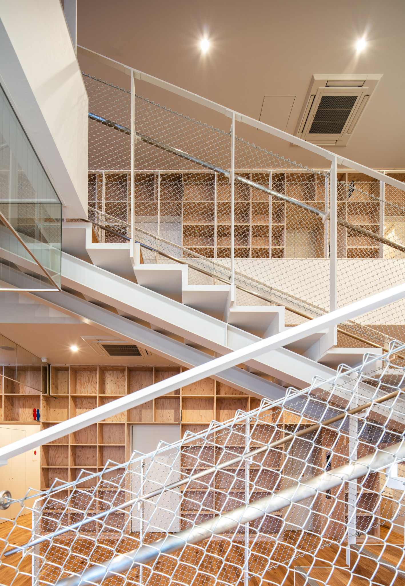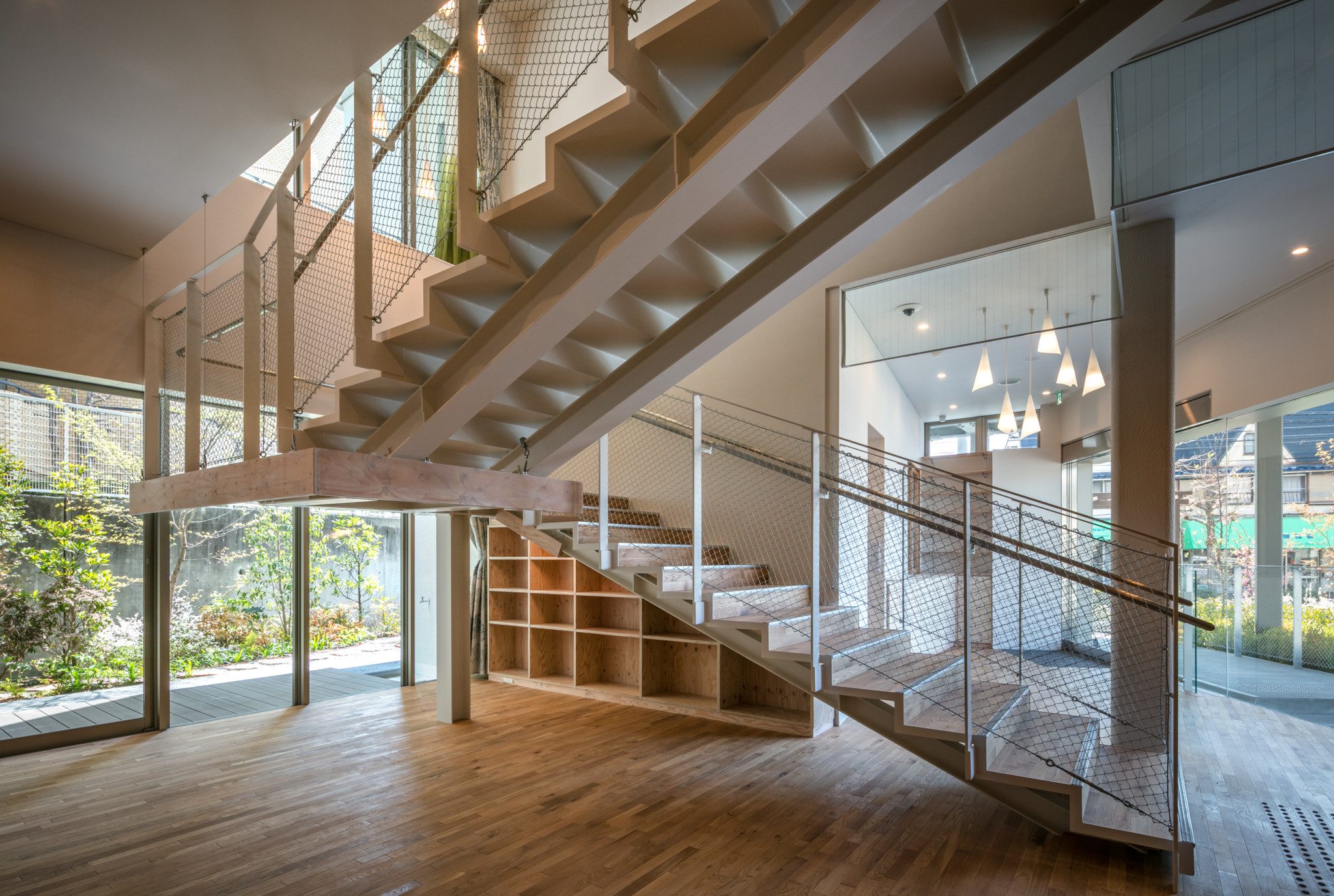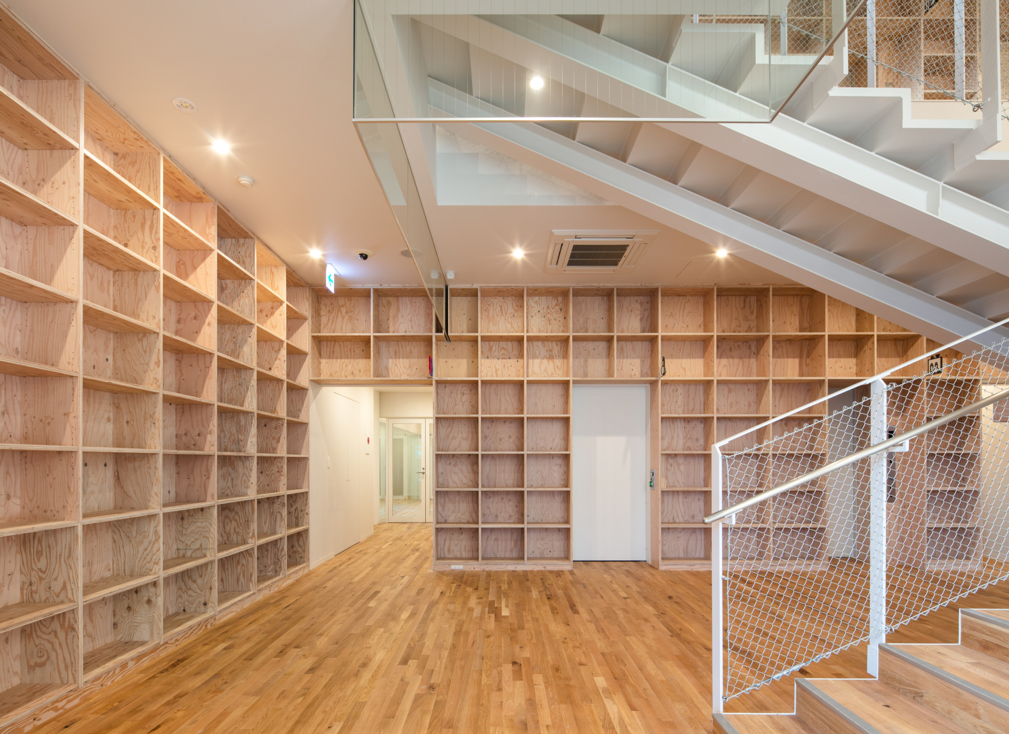 At the heart of the building, a staircase enclosed by wooden bookshelves softly connects the dining area, Japanese-style rooms, and hall, creating a warm, home-like atmosphere befitting the name “house.”