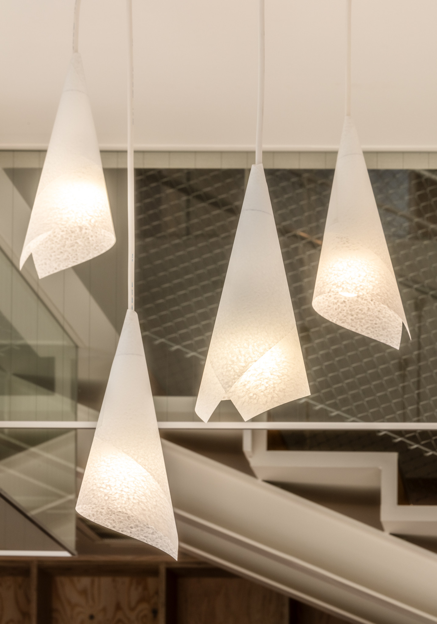 Outside, a rooftop garden with large vegetable plots is linked by walking paths, fostering intergenerational interaction for children and the elderly alike, while letting visitors experience the bounty of nature. The project explores the potential of a “third space” beyond home or office, emphasizing connection and community.